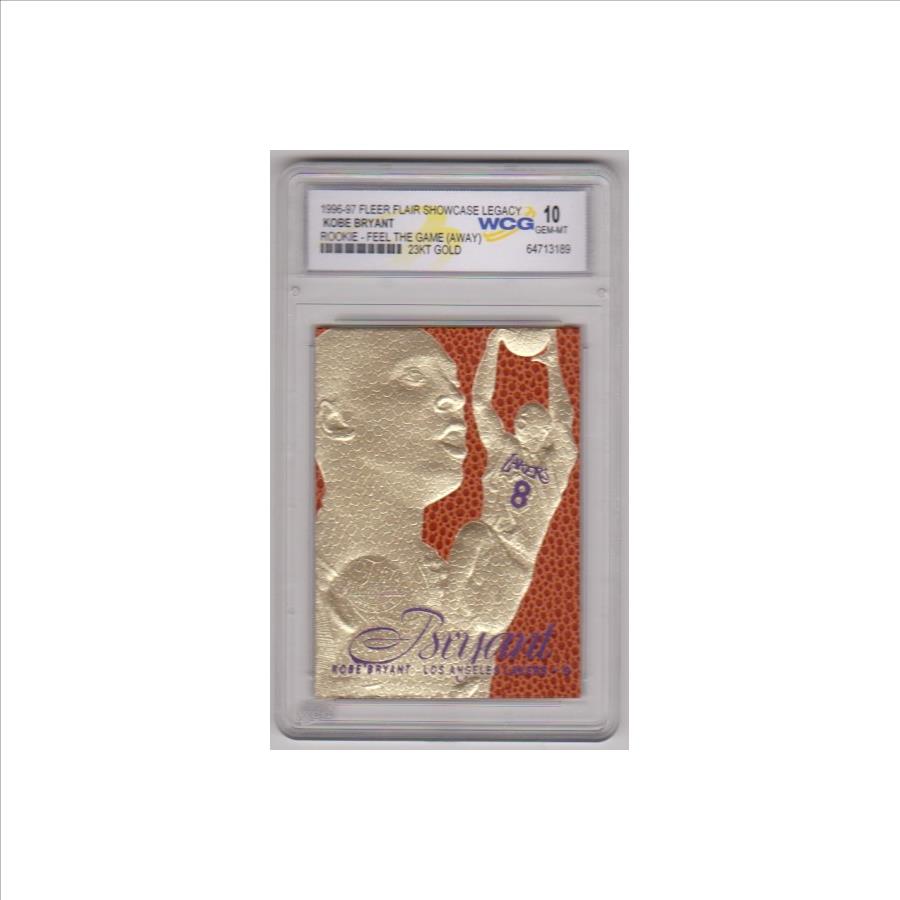 This is a 1996-97 Fleer Flair Showcase Legacy Feel The Game (Away) 23 Kt Gold Kobe Bryant rookie card that has been graded a Gem Mint 10 by WCG.  The holder has some light surface wear, but overall this is a sharp graded rookie card of this NBA Hall of Famer.