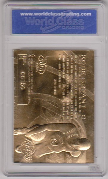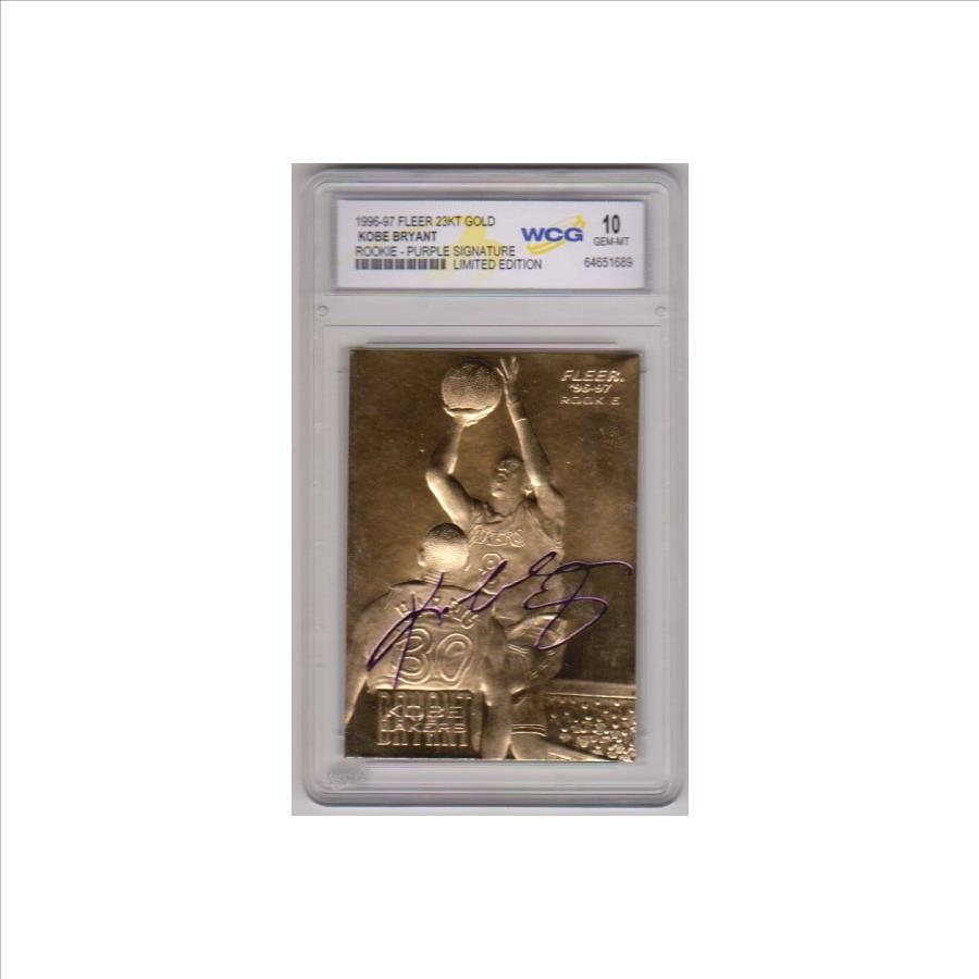 This is a 1996-97 Fleer w/ Purple Signature (Printed Facsimile, not hand signed) 23 Kt Gold Kobe Bryant rookie card that has been graded a Gem Mint 10 by WCG. The holder has some light surface scuffs on the front, but overall this is a sharp graded rookie card of this NBA Hall Of Famer.