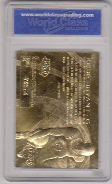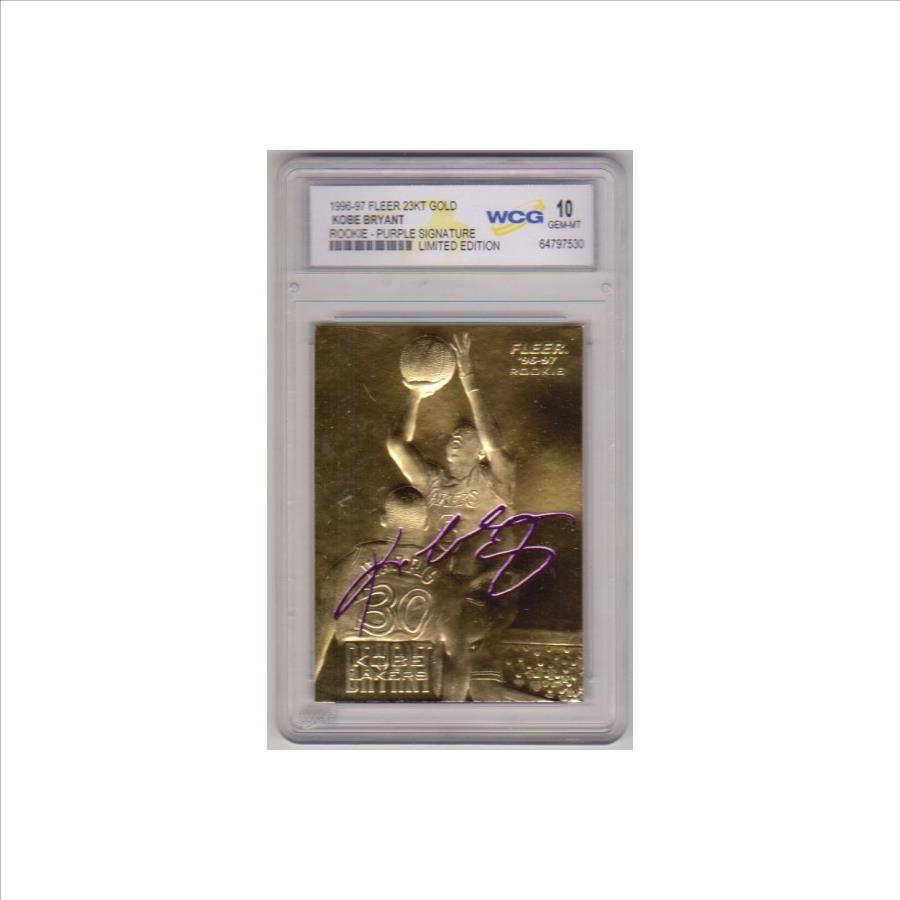 This is a 1996-97 Fleer w/ Purple Signature (Printed Facsimile, not hand signed) 23 Kt Gold Kobe Bryant rookie card that has been graded a Gem Mint 10 by WCG. The holder has some surface wear, but overall this is a sharp graded rookie card of this NBA Hall Of Famer.
