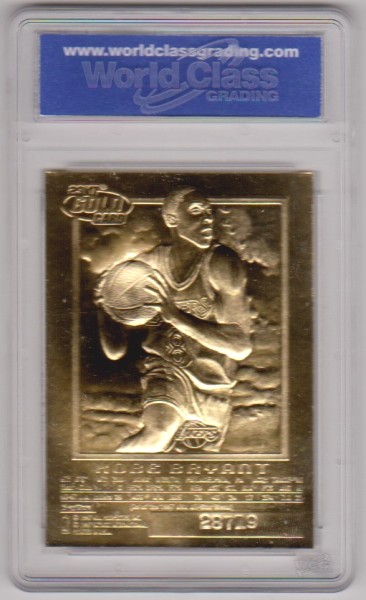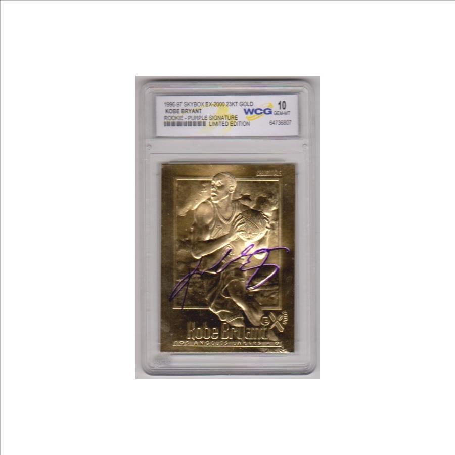 This is a 1996-97 Skybox EX-2000 w/ Purple Signature (Printed Facsimile, not hand signed) 23 Kt Gold Kobe Bryant rookie card that has been graded a Gem Mint 10 by WCG.  The holder has a couple of small light surface scuffs, but overall this is a sharp graded rookie card of this NBA Hall of Famer.