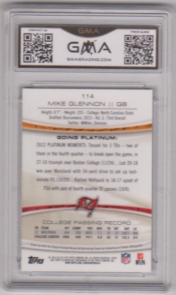 This is a Mike Glennon 2013 Topps Platinum Orange Refractor #114 insert rookie card that has been graded a Gem Mint 10 by GMA. The holder has some light surface wear, but overall this is a nice graded Glennon rookie card.