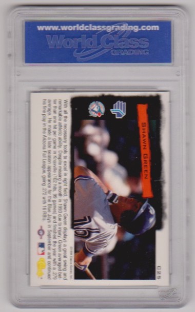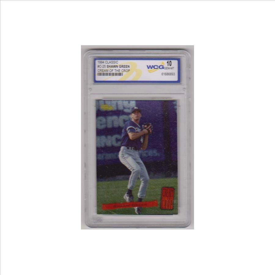 This is a Shawn Green 1994 Classic Minor League Cream Of The Crop #C-25 rookie insert card that has been graded a Gem Mint 10 by WCG.  The holder has some light scuffs, but overall this is a sharp graded rookie card of this retired baseball All-Star.
