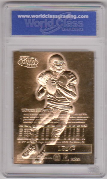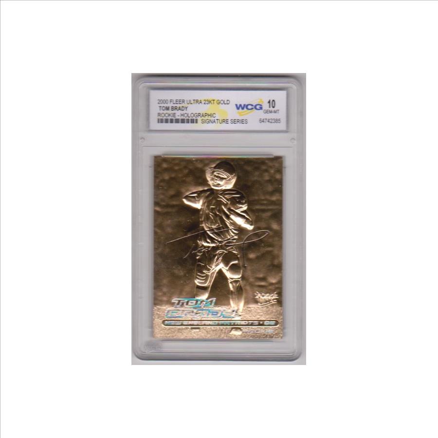 This is a 2000 Fleer Ultra Tom Brady 23 Kt Gold Holographic Signature Series Rookie Card that has been graded a Gem Mint 10 by WCG. There are a couple of light scuffs on the front of the holder, but overall this is a sharp graded rookie card of this retired NFL star.