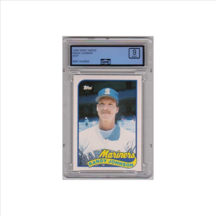 This is a Randy Johnson 1989 Topps Traded #57T rookie card that has been graded a Mint 9 by MPE. The holder has some surface wear/scuffs, but overall this is a nice graded rookie card of this baseball Hall of Famer.
