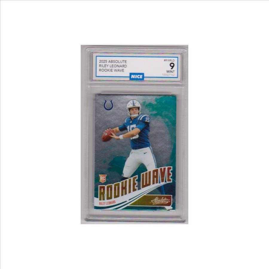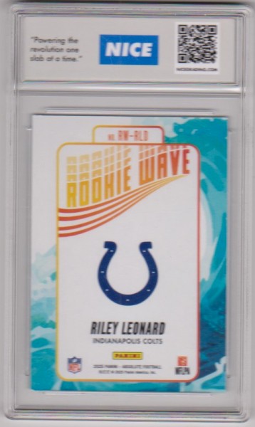 This is a Riley Leonard 2025 Panini Absolute Rookie Wave #RW-RLD insert card that has been graded a Mint 9 by Nice Grading.  The holder has some light surface wear/scuffs, but overall this is a nice looking graded Leonard rookie card.