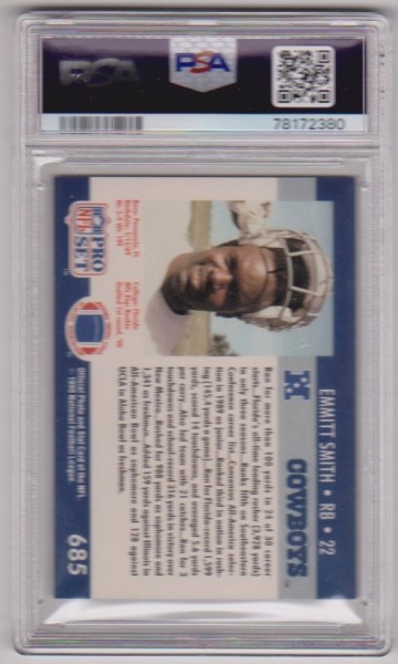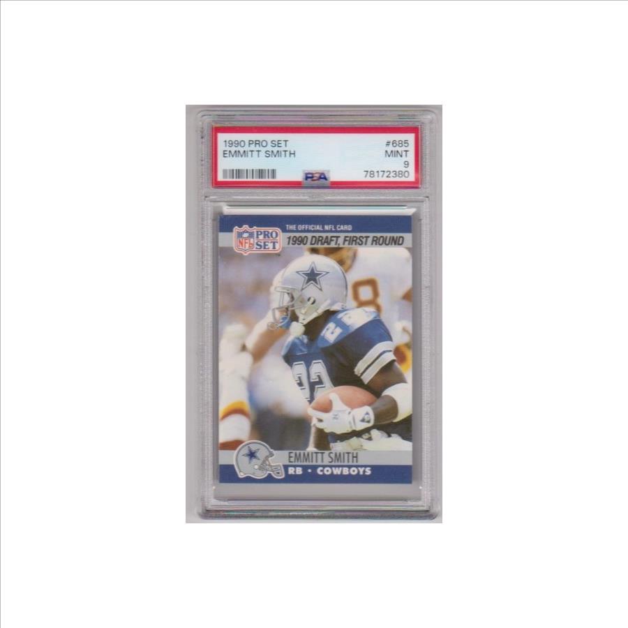 PropertyRoom.com's trusted merchant, Sports Collectibles, presents this online auction for the above Rookie Graded PSA Mint 9 - Emmitt Smith 1990 Pro Set #685 Card.