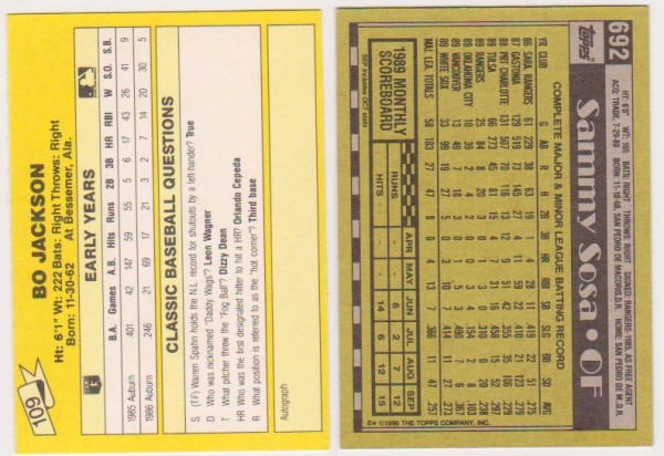 Rookies - Bo Jackson 1987 Classic + Sammy Sosa 1990 Topps Rookie Pair