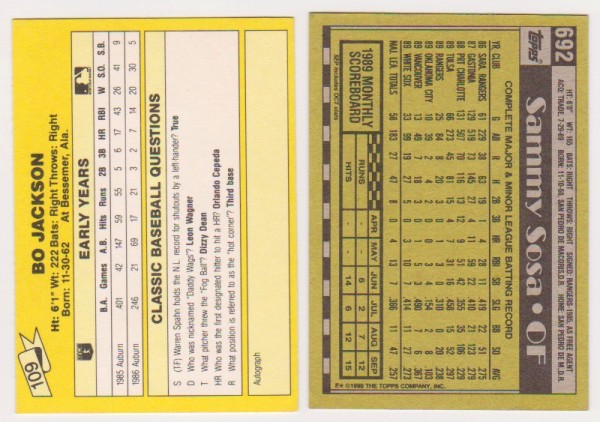 Rookies - Bo Jackson 1987 Classic + Sammy Sosa 1990 Topps Rookie Pair