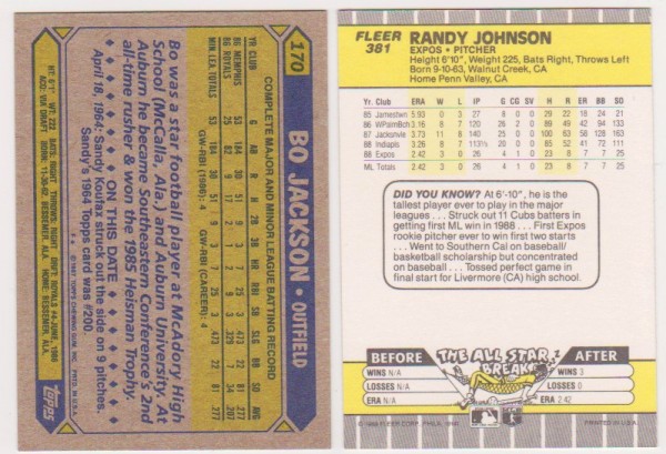 Rookies - Bo Jackson 1987 Topps + Randy Johnson 1989 Fleer Rookie Pair