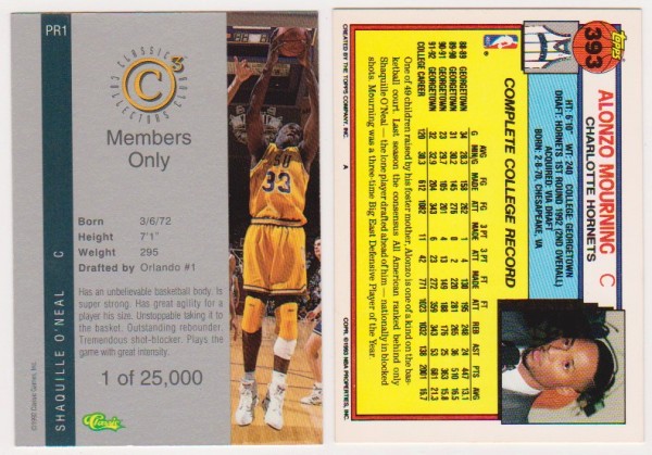 This is a Shaquille O'Neal and Alonzo Mourning rookie card pair.  You get one each of Shaquille O'Neal 1992 Classic 4-Sport C3 Collectors Club #PR1 Promo (1 of 25,000) card and Alonzo Mourning 1992-93 Topps #393.  This is an approximately Near Mint rookie pair of these two NBA Hall of Famers.