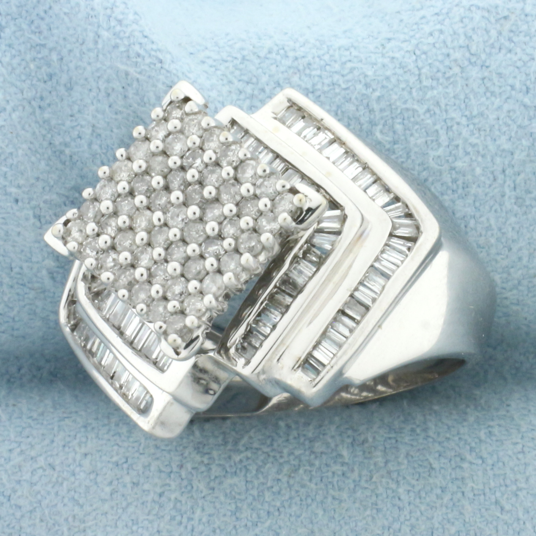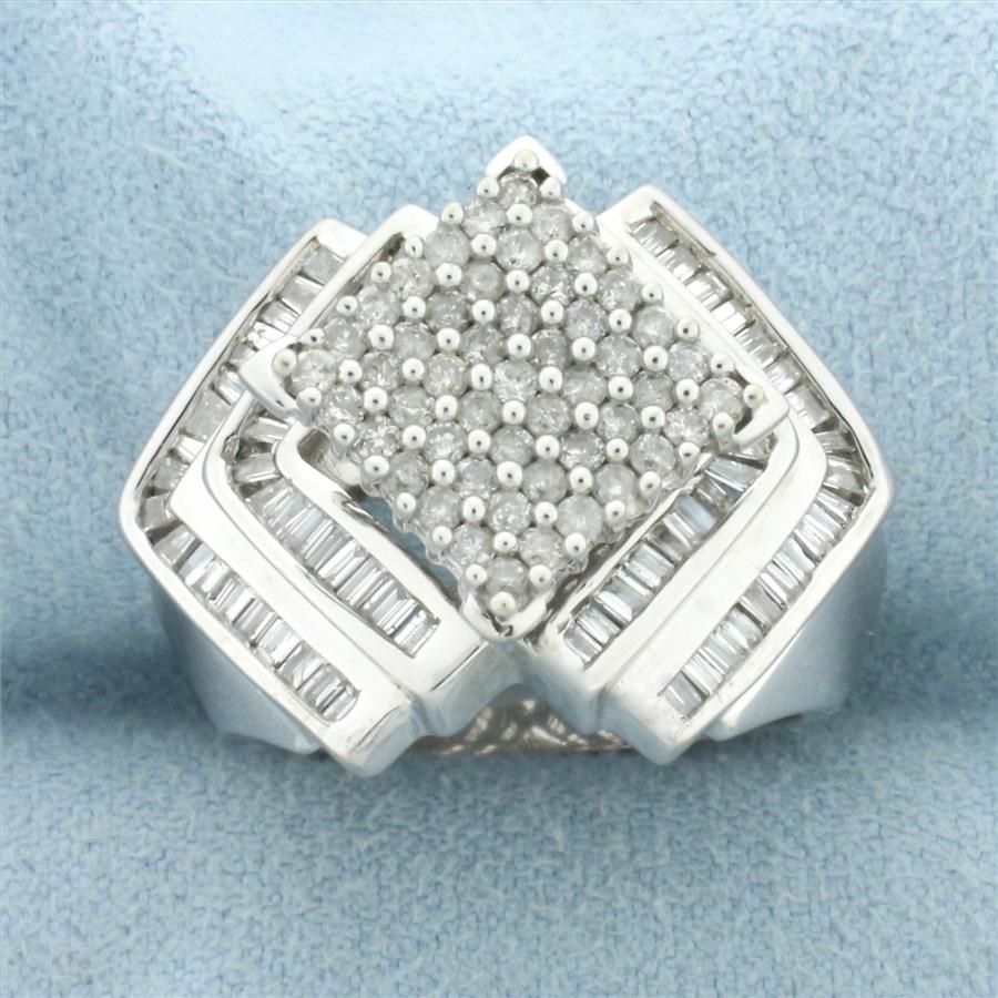 In 14k White Gold. Contains forty-nine round and seventy-eight baguette high quality diamonds, 1.5ct TW, SI clarity/H color. 18.4mm wide at the widest point. Size 6.5. 8.2g.