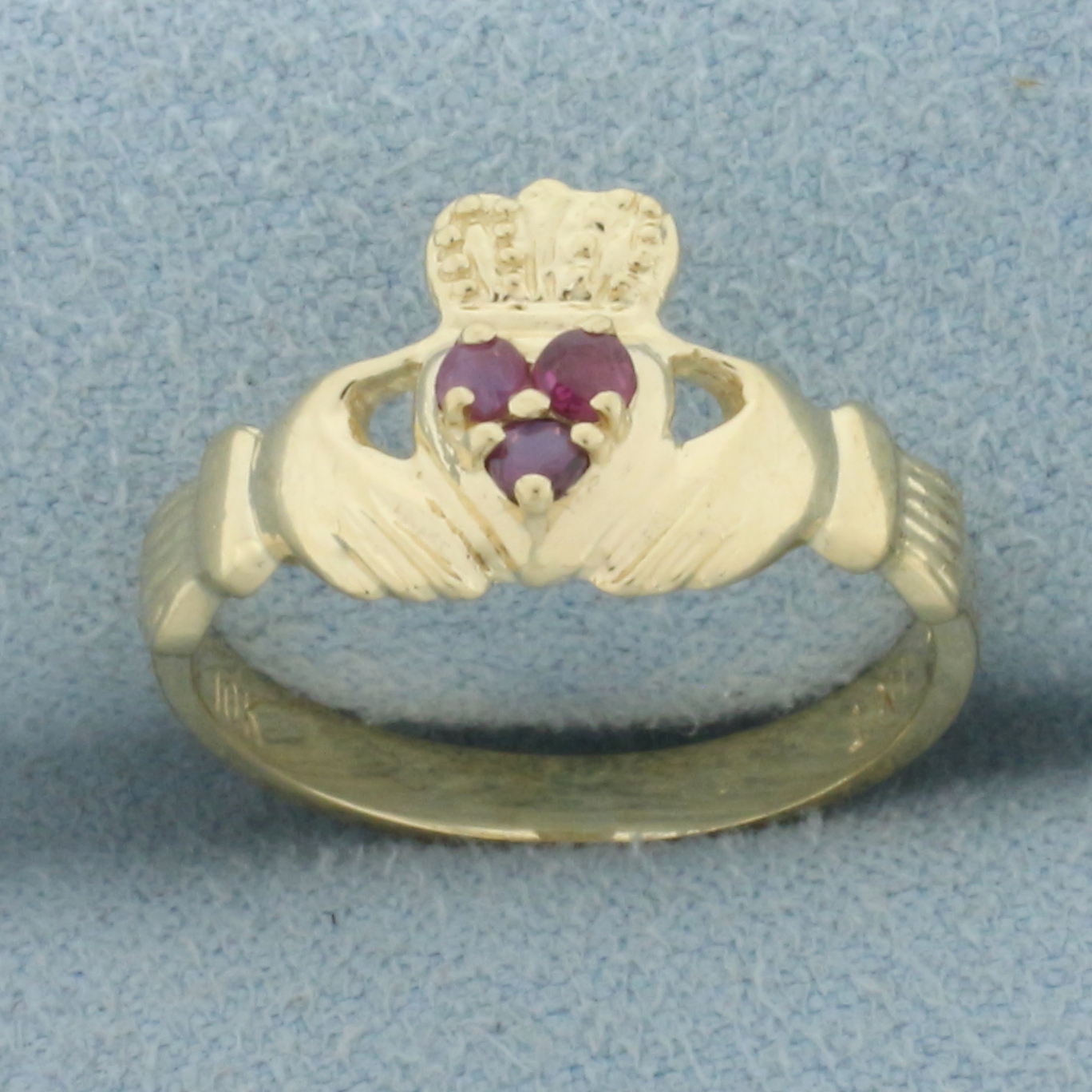 In 10k yellow gold. Contains three high quality natural 2mm Ruby gemstones with intense color and excellent clarity. 10mm wide at center of ring. Size: 5. 1.9g.