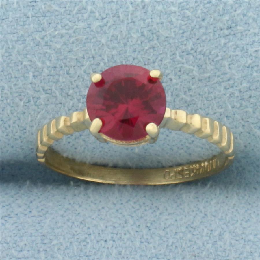 In 14k Yellow Gold. Contains one high quality 1ct Ruby gemstone with intense color and excellent clarity. Size 5. 1.4g.
