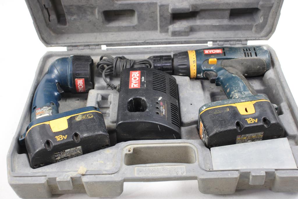 Ryobi 1/2" Cordless Drill, Flashlight, And 18V Battery Charger, 3 Piece Tool Set