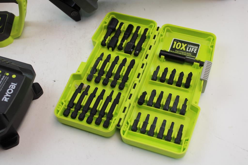 • Accessories: charger, 2 batteries, bit set, & tool bag
