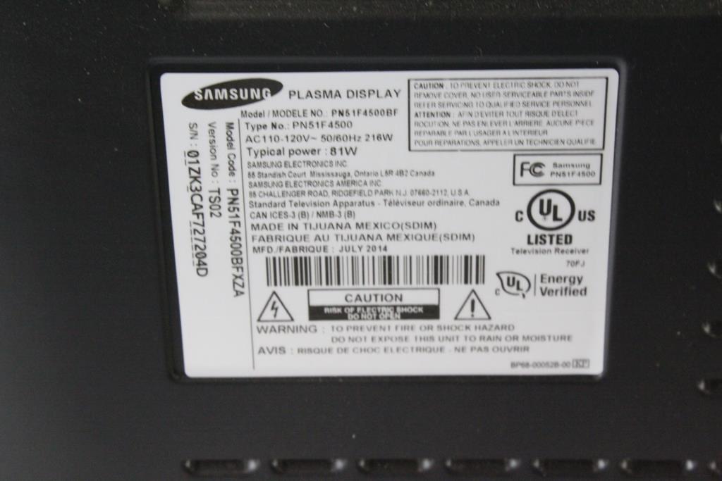 Get a great deal with this online auction for a TV presented by Property Room on behalf of law enforcement or public agency client. Model: PN51F4500 Screen Size: 51" Date of Manufacture: 07/2014 Measurements: 46.5" x 27.75" Base: Yes Remote Control: Yes Power Cord: No Physical Condition: Good, with scratches, scuffs, dirt, and wear Testing Results: Item was tested for power only and it powered on, displayed menu. Input and output ports were not tested and may be non-functional. Item is sold "As Is".