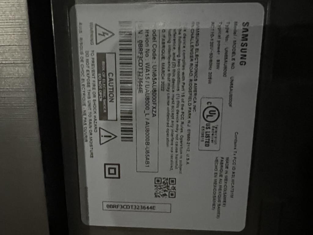 Get a great deal with this online auction presented by PropertyRoom.com on behalf of a law enforcement or public agency client. Model: UN65AU8000FXZA Screen Size: 65" Date of Manufacture: 2021 Measurements: height 32", length 57" Base: no Remote Control: no Power Cord: no Physical Condition: cracked back panel, broken power button Testing Results: Item was tested for power only and it powered on, displayed menu. Input and output ports were not tested and may be non-functional. Item is sold "As Is".