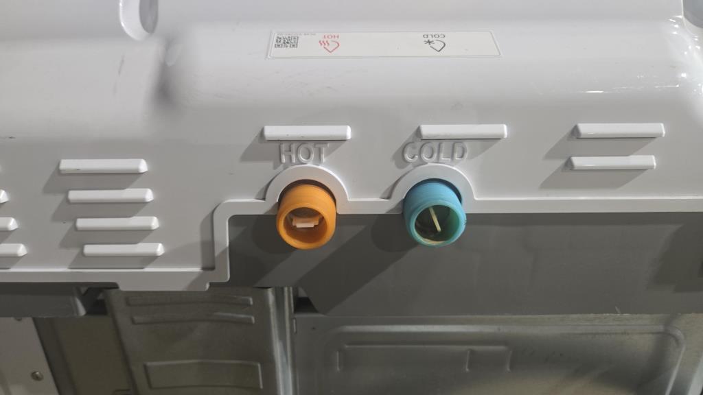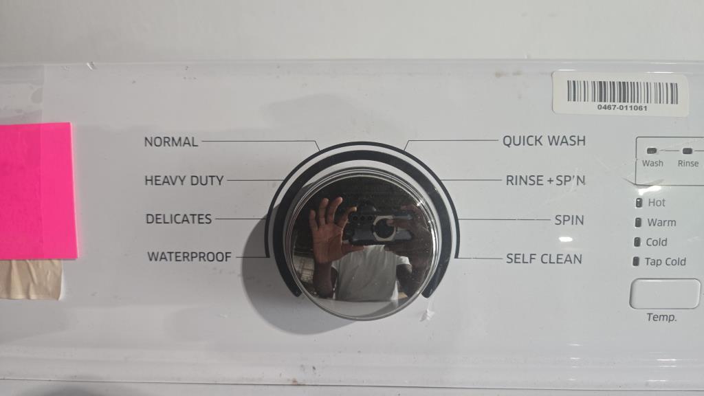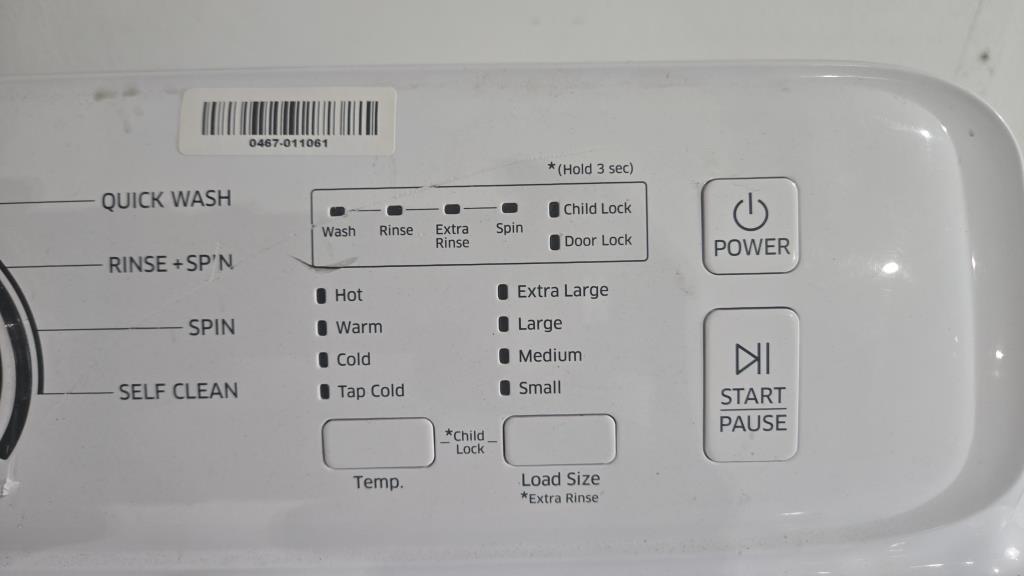 - Item info: electric, hot/cold hookups, power button, start/pause, knob options- normal, heavy duty, delicates, water proof, quick wash, rinse + spin, spin, self clean, lights- wash/rinse, extra rinse, spin, child + door lock/ hot, warm, cold, tap cold, extra large, large, medium, small, temp load size