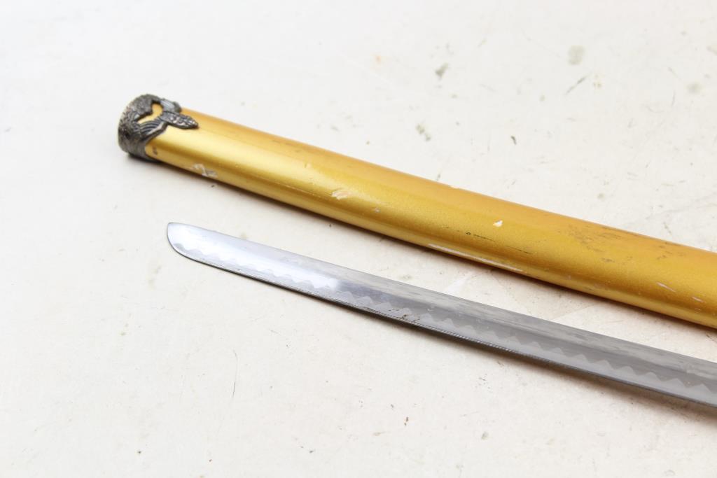 - Cosmetic Condition: Fair condition, visibly worn, has scratches, scrapes and is dirty. Scabbard "paint" has chips and has blank spots. End cap appears to be missing. Parts/ pieces/ accessories may be missing.