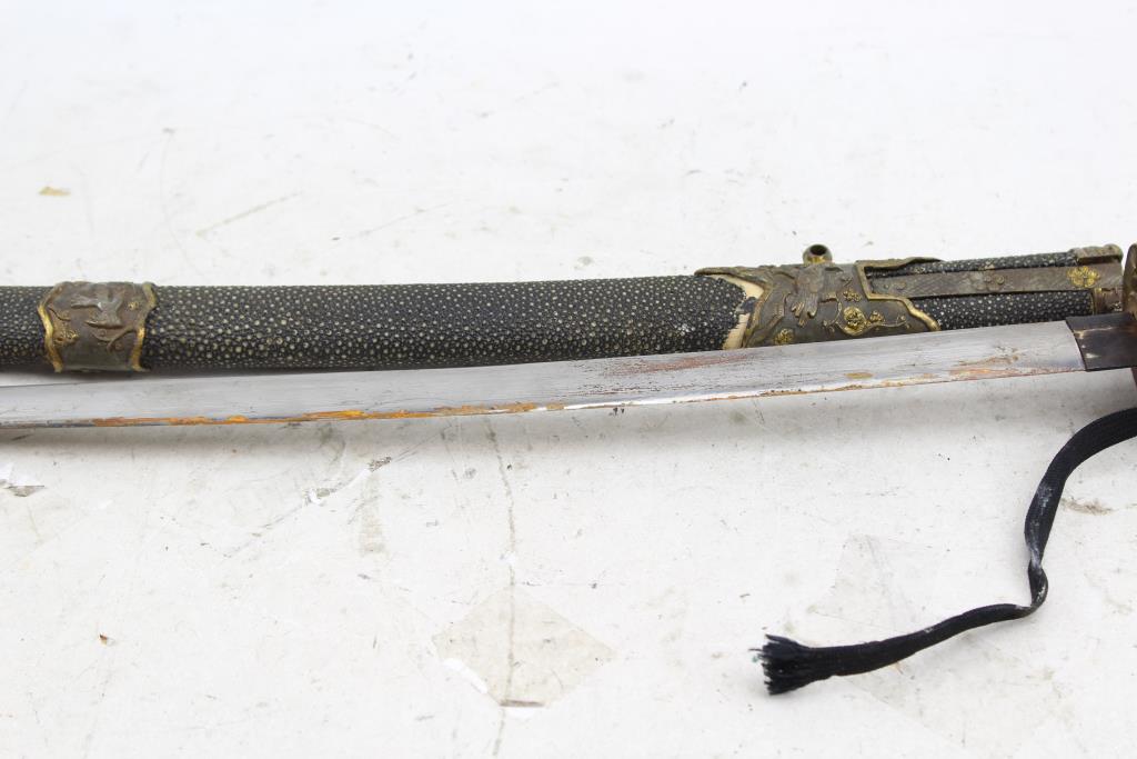 - Cosmetic Condition: Fair to poor condition, visibly worn, has scratches, scrapes, may have rust and is dirty. Scabbard "paint" has chips and has blank spots. End cap appears to be missing. Parts/ pieces/ accessories may be missing.