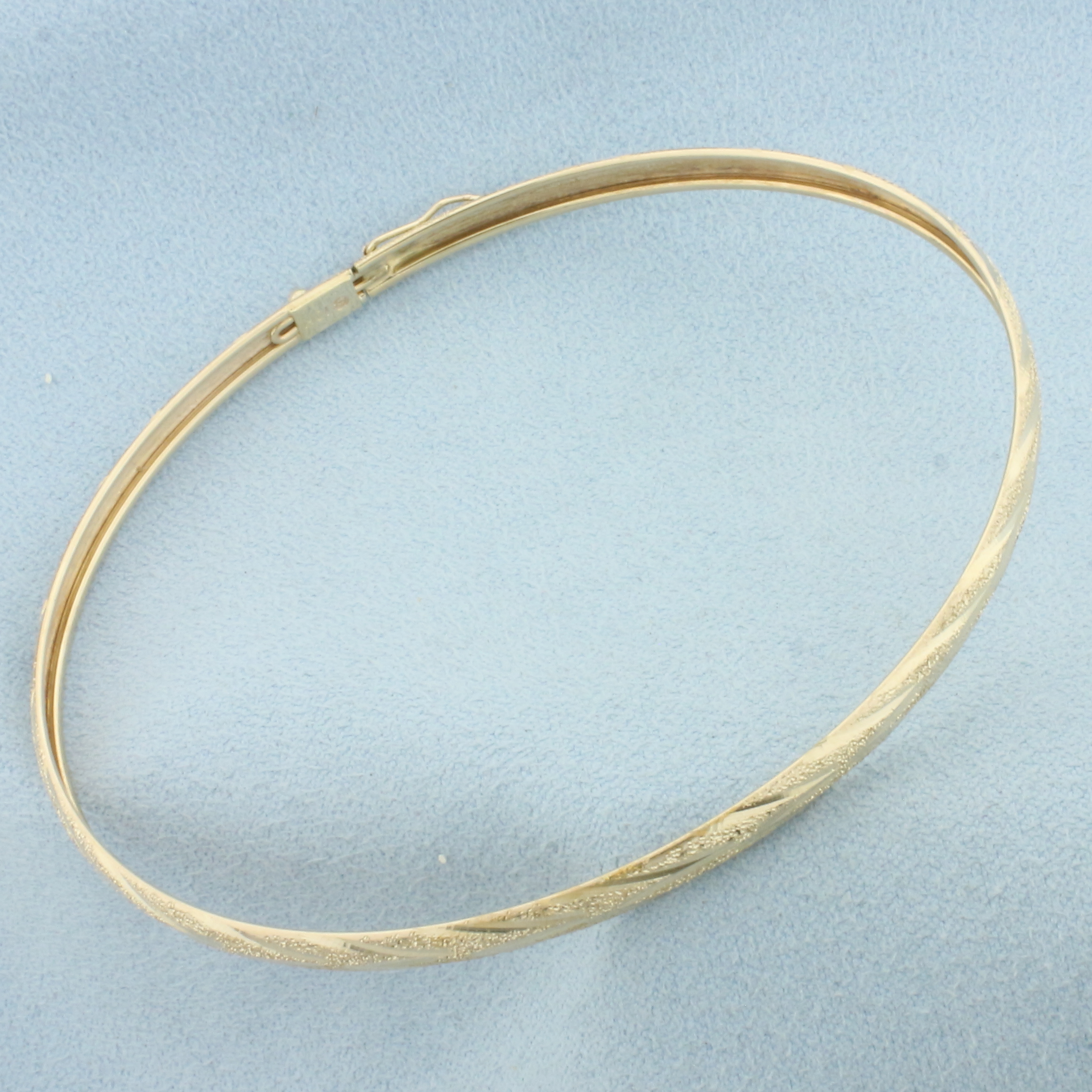 In 10k Yellow Gold. Interior dimensions: 2 7/8 inch by 2 1/4 inch. 5mm wide. Sandblast and diamond cut finish. Concealed clasp with safety latch. 3.4g.