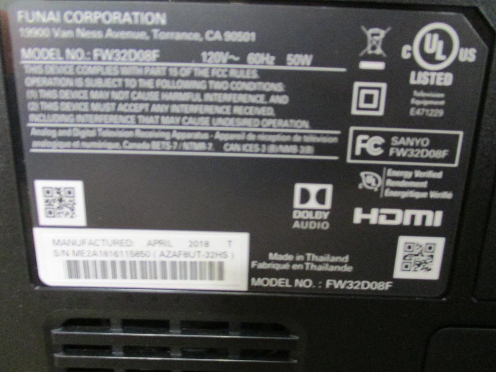 Get a great deal with this online auction presented by PropertyRoom.com on behalf of a law enforcement or public agency client. Model: FW32DO9F Screen Size: 32" Date of Manufacture: 04/2018 Base: yes Remote Control: no Power Cord: yes Manuals: no Physical Condition: good, scratches, nicks, dirty Testing Results: Item was tested for power only and it powered on, displayed menu. Input and output ports were not tested and may be non-functional. Item is sold "As Is".