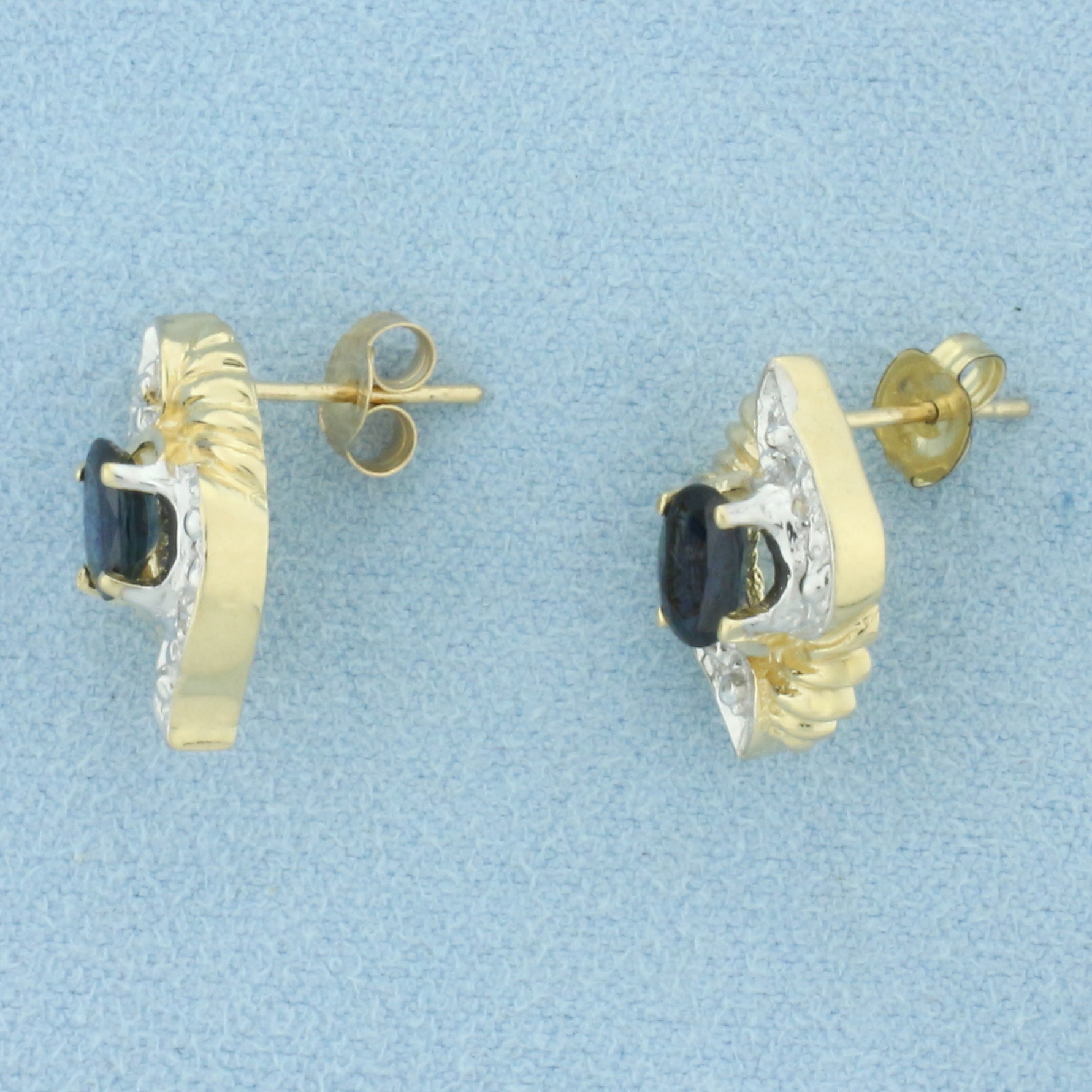 In 14k yellow gold. Contains two high quality natural 4mm by 6mm oval Sapphire gemstones, 1ct TW, with deep color and excellent clarity. Also contains four high quality 1/2pt diamonds. 5/8 inches long and 3/8 inches wide. Friction backs. 4.3g.