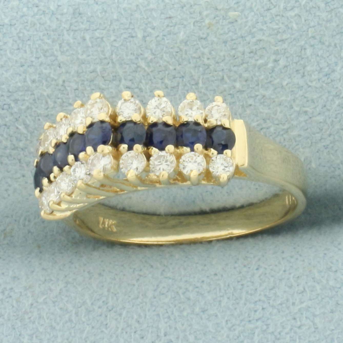 In 14k yellow gold. Contains nine high quality natural AA quality 2.5mm Saphire gemstones with vibrant color and excellent clarity. Also contains eighteen high quality .03ct diamonds, SI clarity/H color. Size: 6.25. 3.4g.