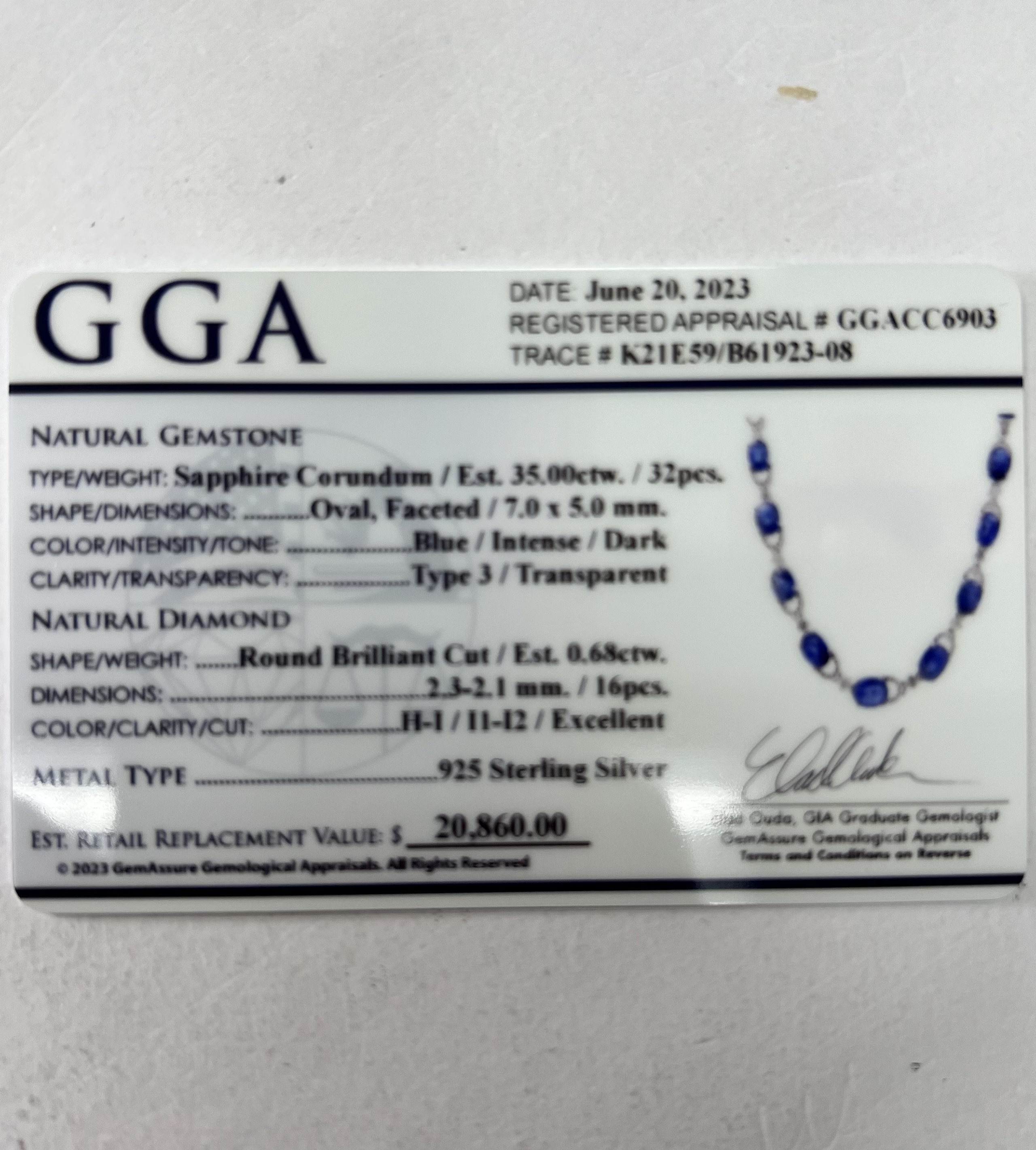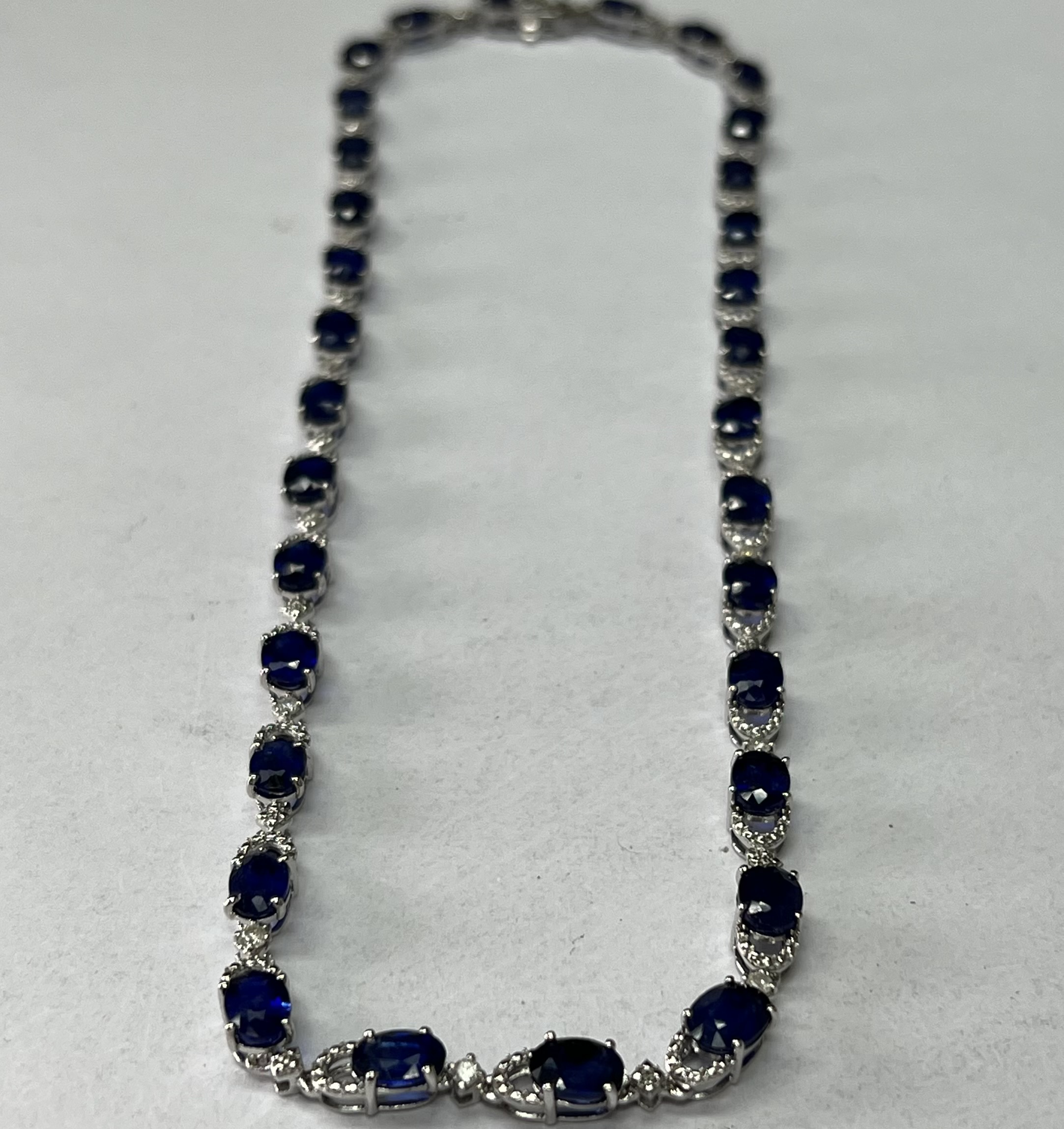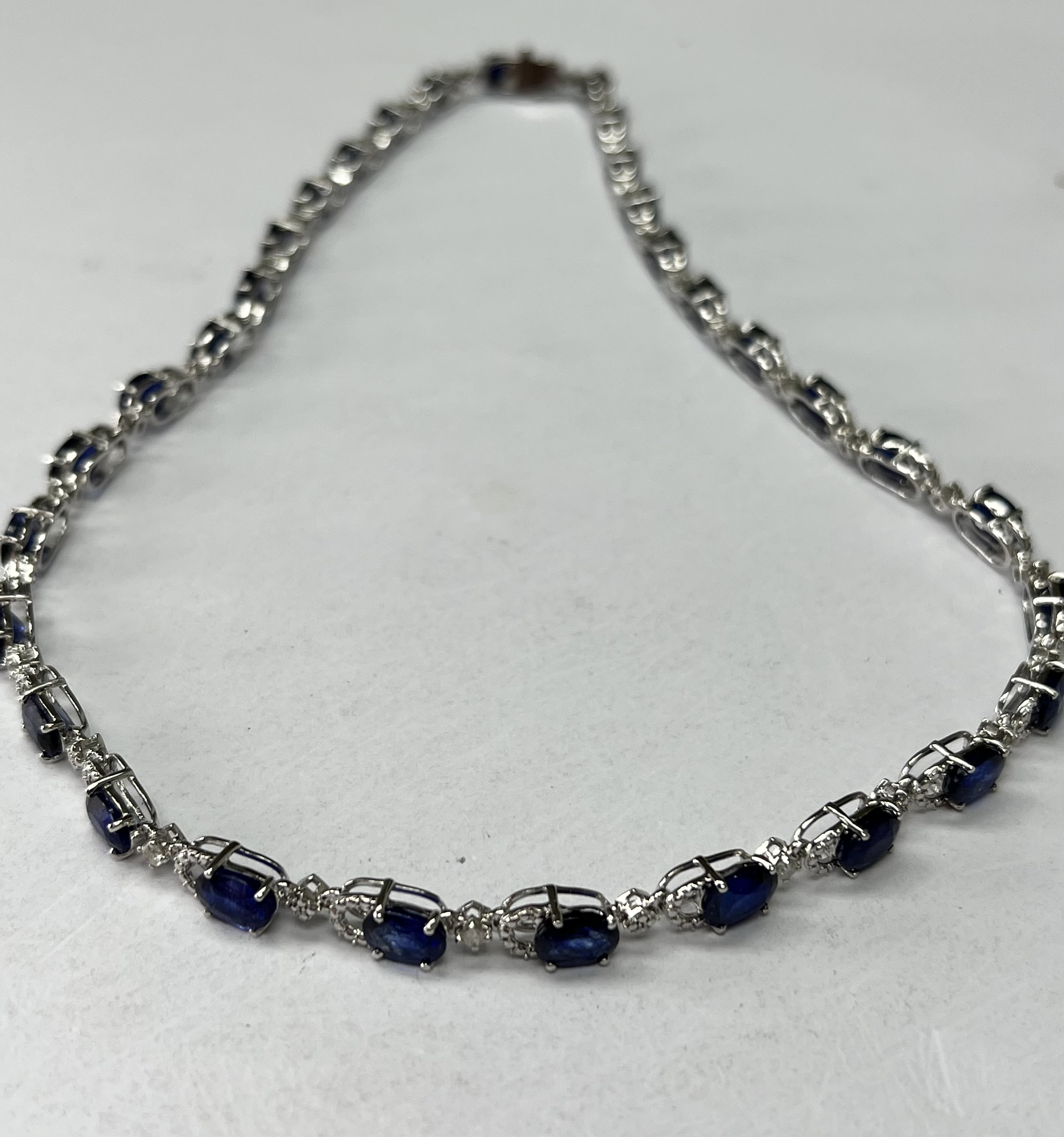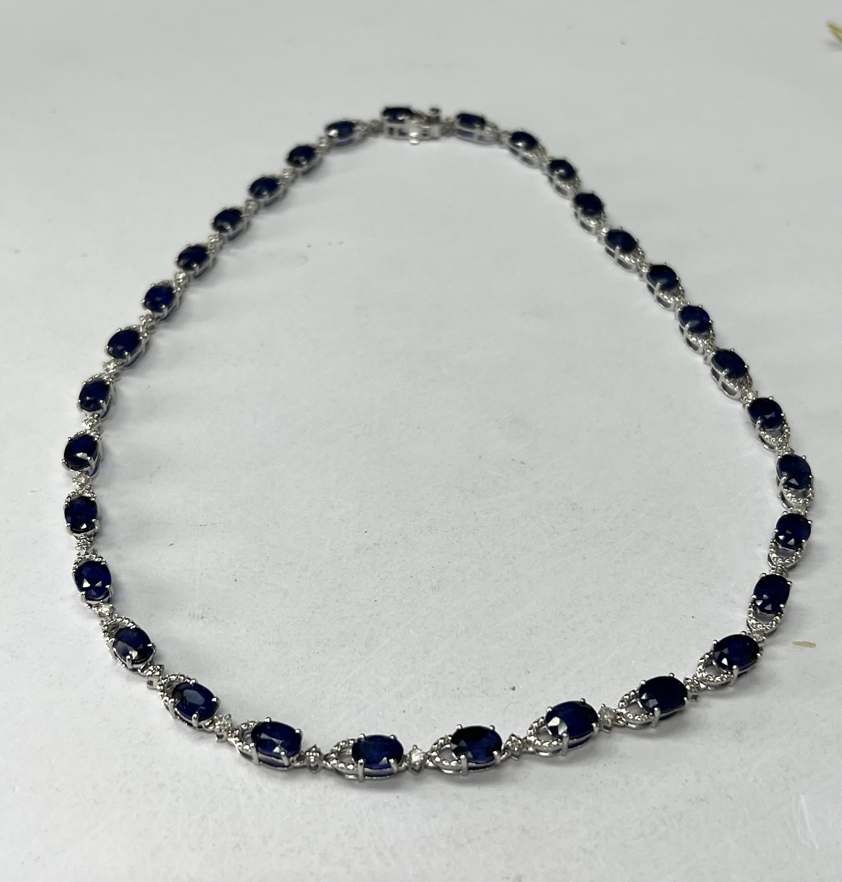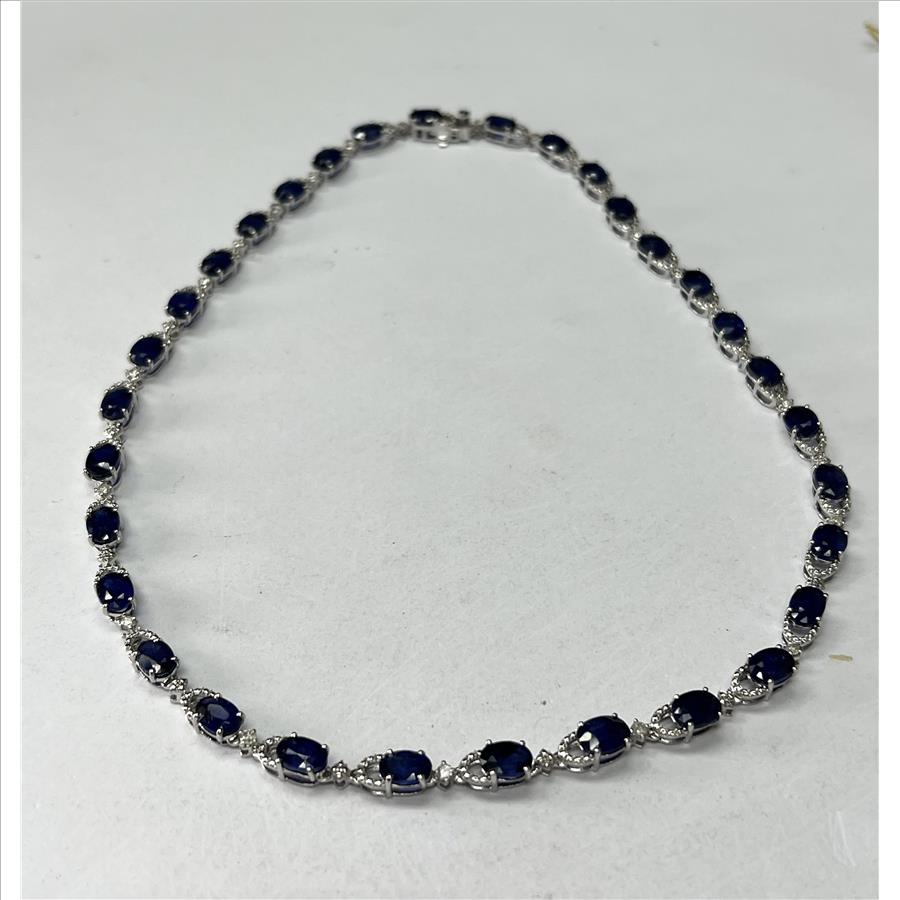 STUNNING BLUE SAPPHIRE AND DIAMOND NECKLACE SET IN STERLING SILVER