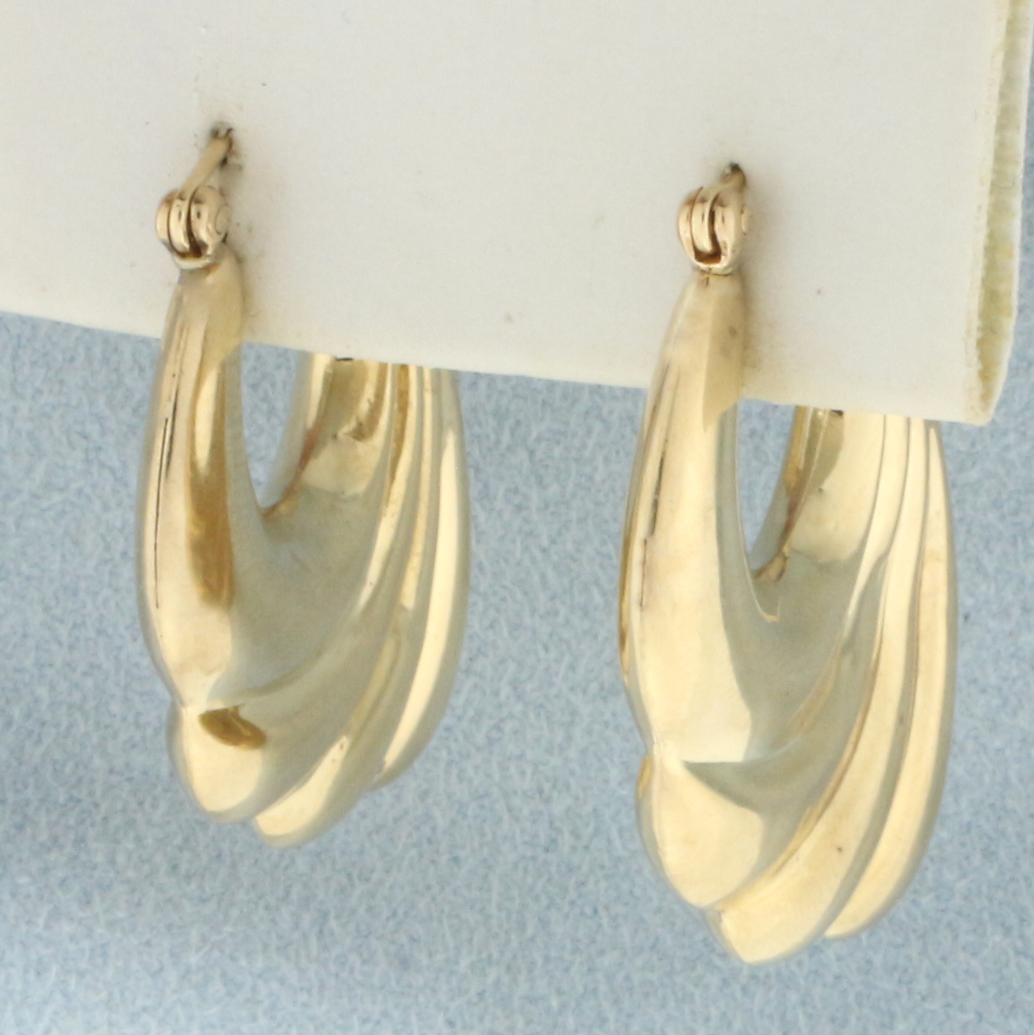 In 14k yellow gold. 1 3/8 inches long x 1 inch wide. Minor indentations, not noticeable. Leverbacks. 5.3g.