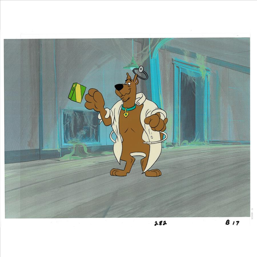 An original production cel from "The Thirteen Ghosts of Scooby-Doo" with reproduction offset lithograph background. Featured is an original production cel on acetate depicting the character Scooby-Doo from the Hanna-Barbera cartoon Scooby-Doo. Inscriptions are written in plate to the lower edge of each master, and certificates of authenticity are included to the versos. This piece is presented in protective plastic sleeve with a COA from Classic Moments.