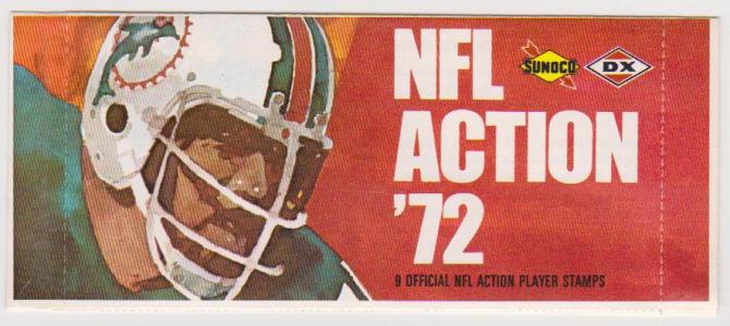 This is an original sealed 1972 Sunoco NFL Action '72 Stamps pack.  There are nine stamps of NFL players in the pack.  This is a tough to find 44 year old pack.  This one features the Miami Dolphins art cover.