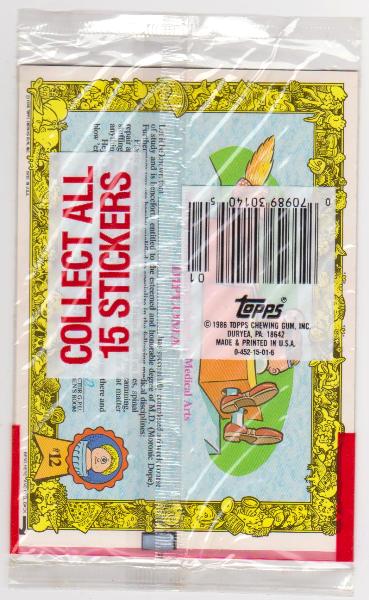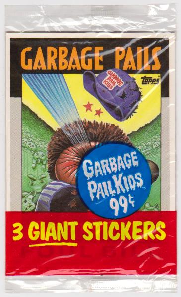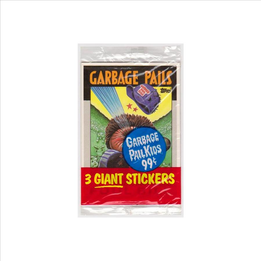 This is an unopened 1986 Topps Garbage Pail Kids Giant Stickers pack.  It contains 3 giant stickers.  This is a nice clean unopened 38 year old Garbage Pail Kids pack.