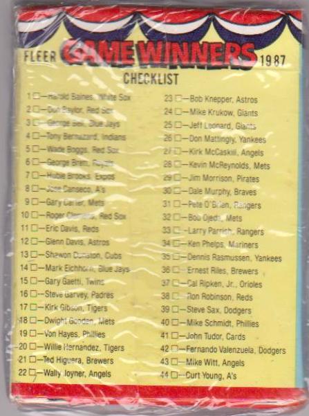 This is a Factory Sealed 1987 Fleer Baseball Game Winners 44 card set.  It is loaded with stars including Wade Boggs, George Brett, Jose Canseco, Don Mattingly, Cal Ripken, Jr., Mike Schmidt, Roger Clemens and more. This is an original unopened 38 year old set.