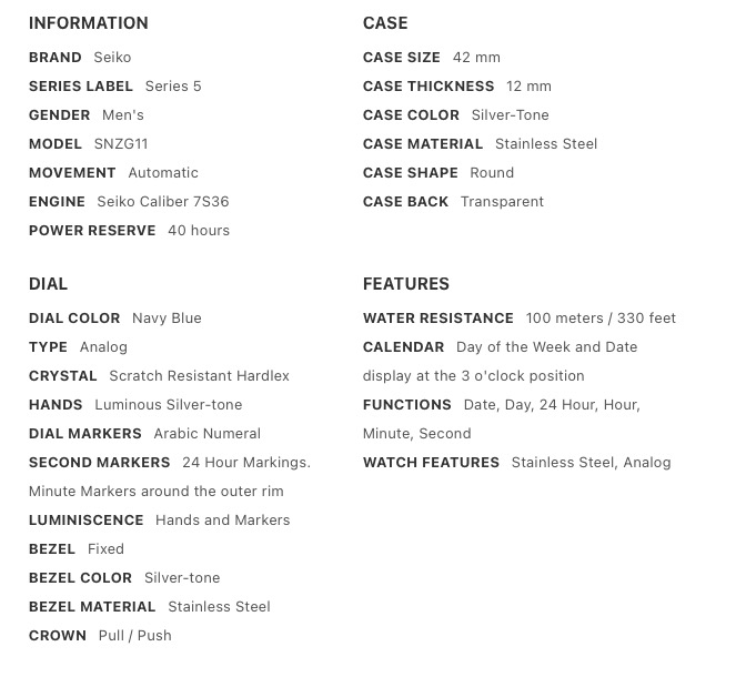 WATCH TECHNICAL SPECS
