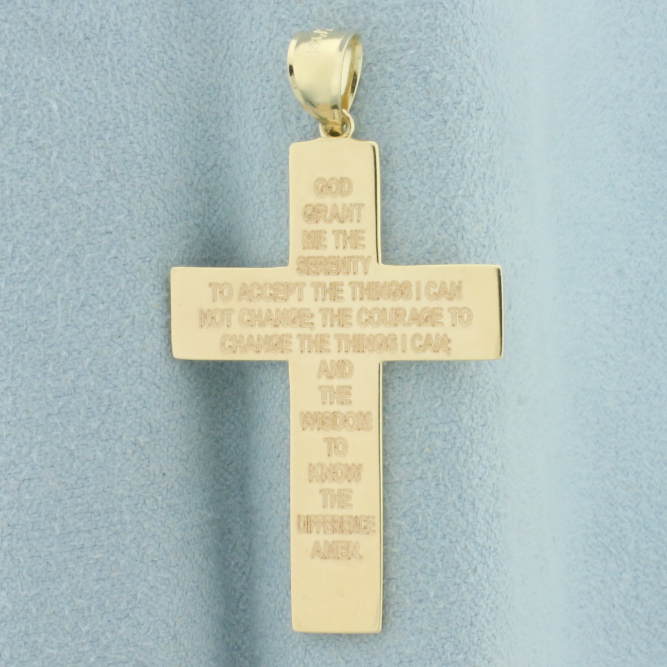 In 14k yellow gold. 1 /34 inches long. 1 inch wide. Serenety prayer on back: "God grant me the serenity to accept the things I can not change, the courage to change the things I can and the wisdom to know the difference amen."