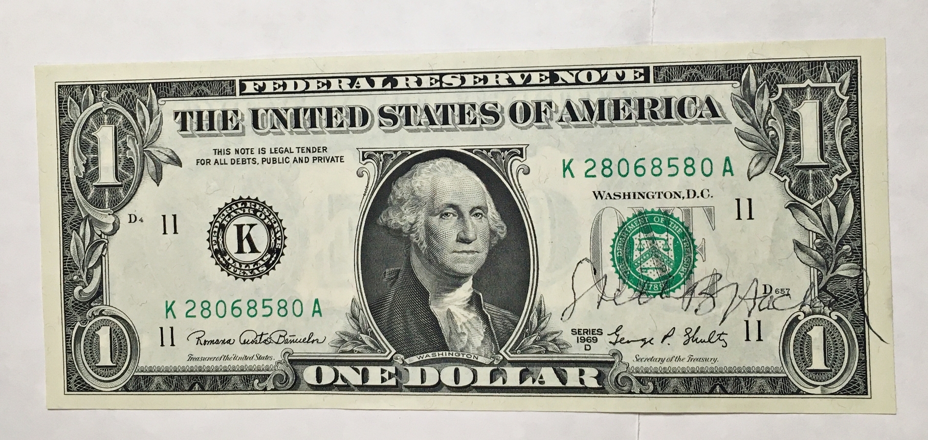 Series 1969D $1 Federal Reserve Note; Dallas, TX*Autographed by Stella B. Hackel; Director US Mint*Crisp Uncirculated