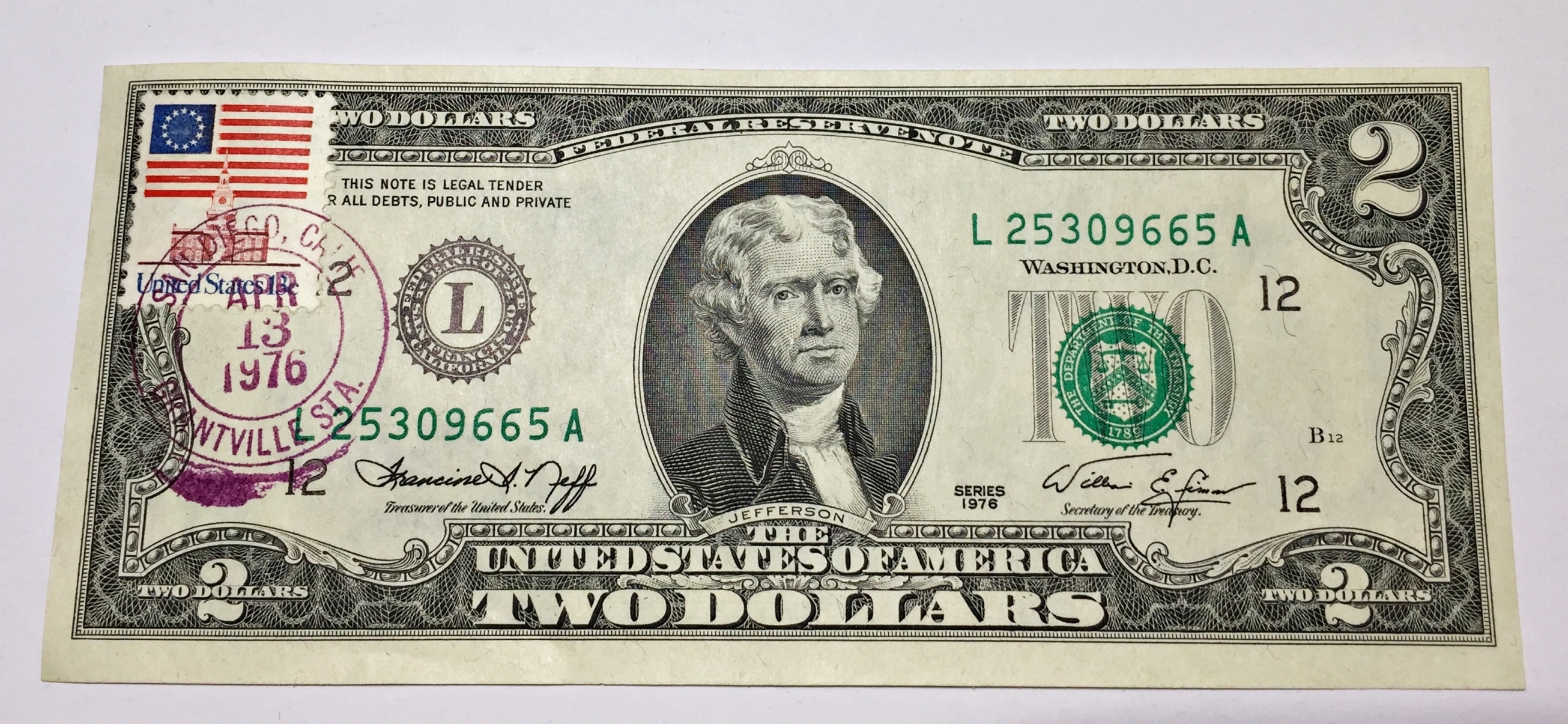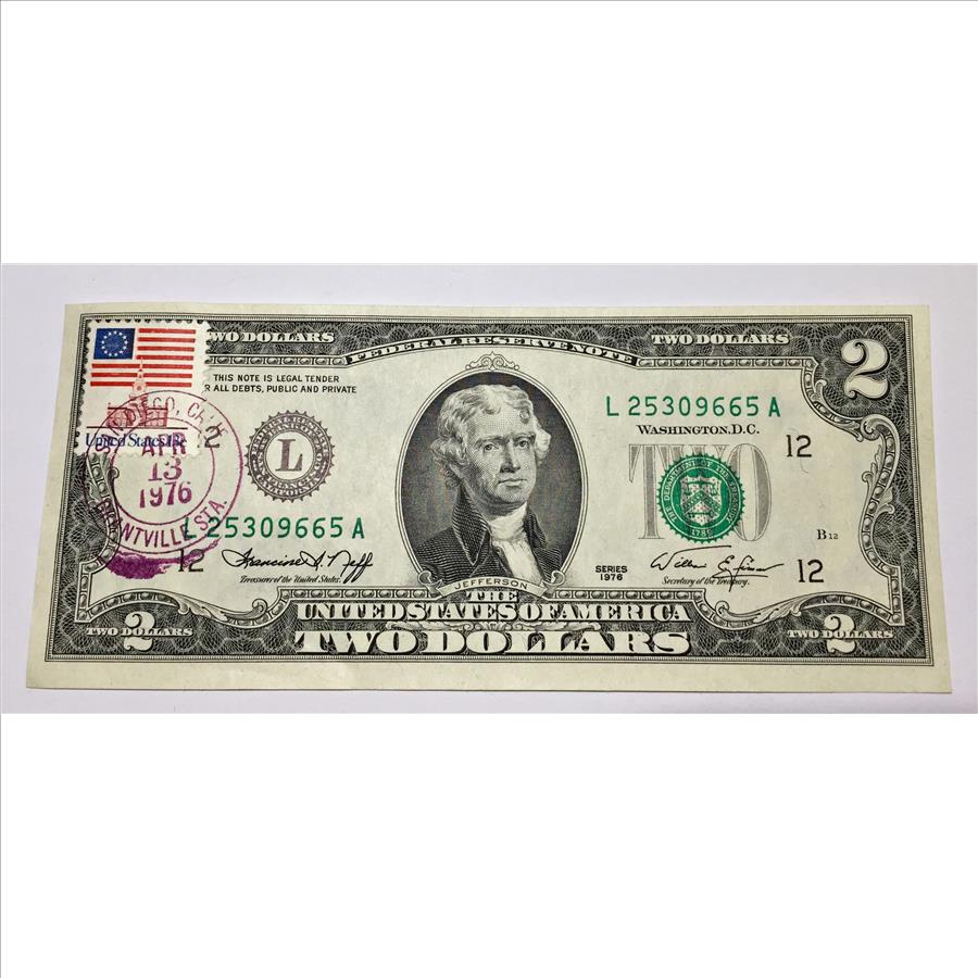 Series 1976 $2 Federal Reserve Note; San Francisco, CA*With Stamp*Commemorating the United States Bicentennial*Crisp Unc