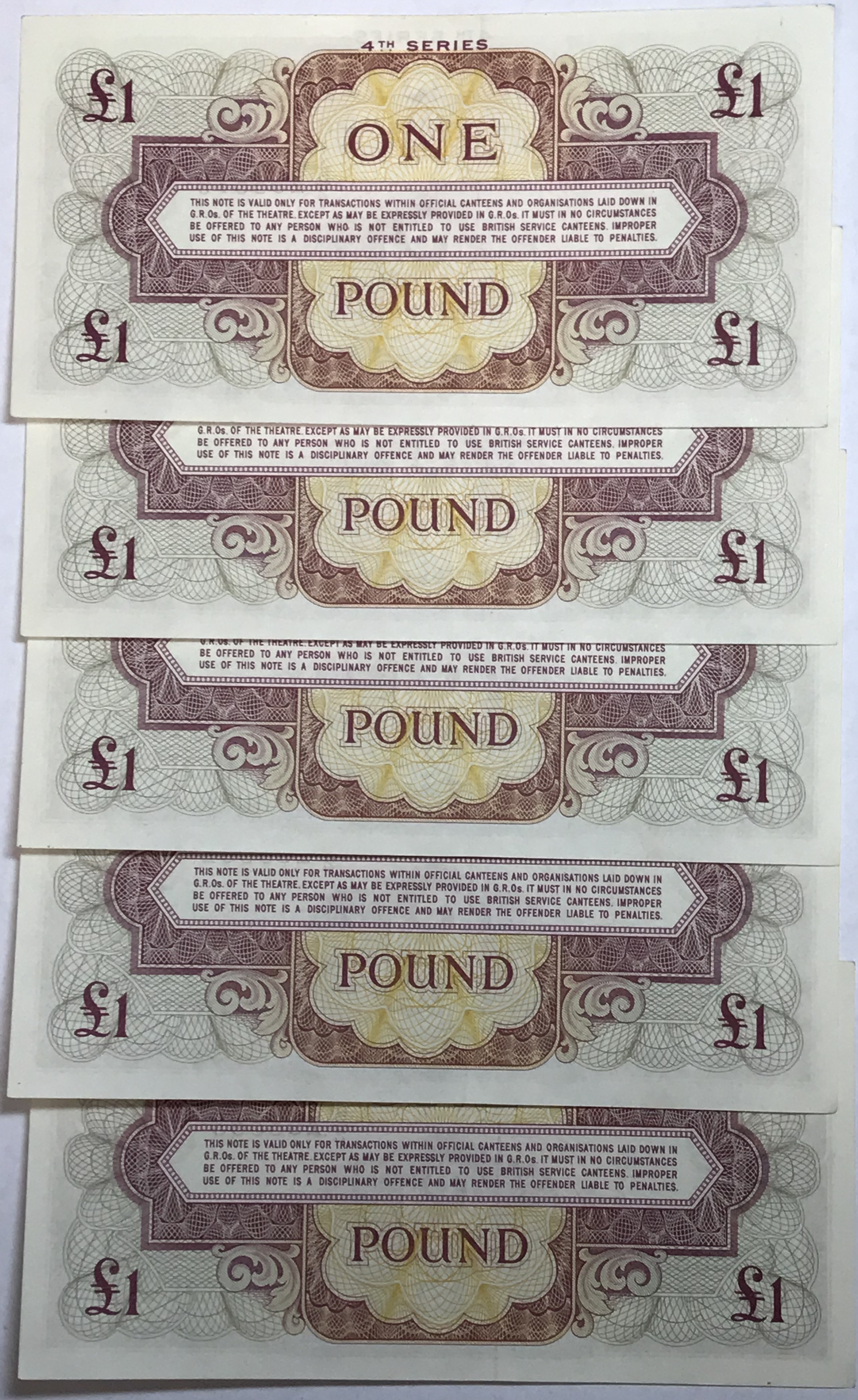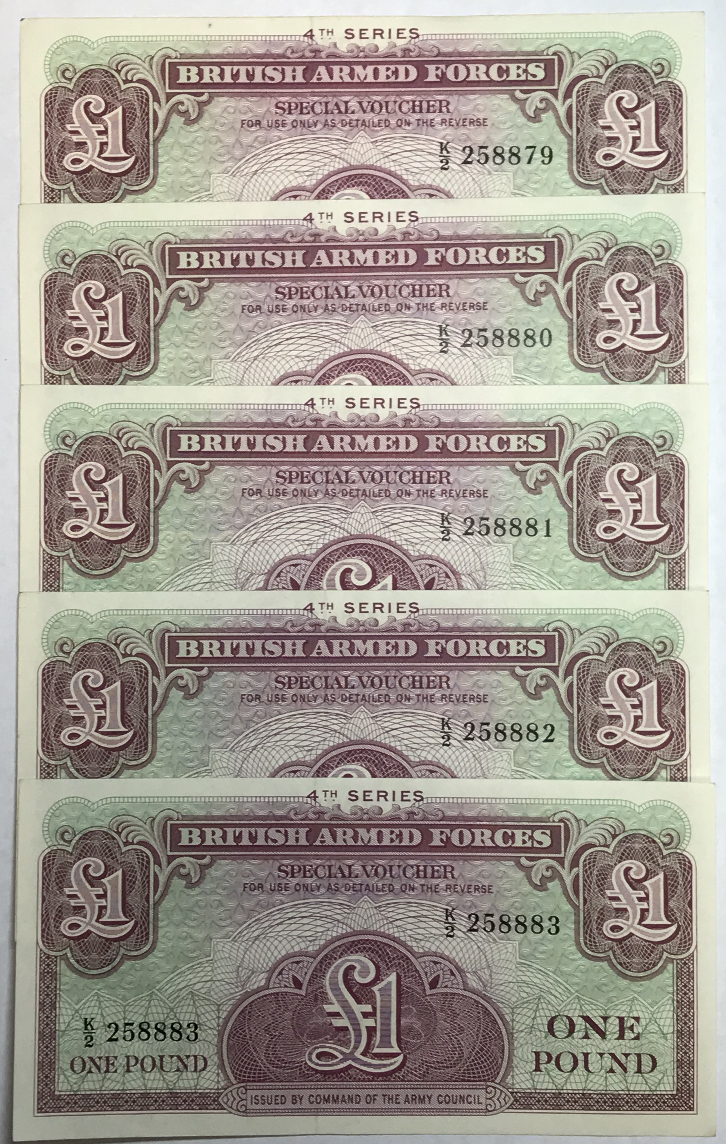 Set of 5 Consecutive Serial Numbered 4th Series British Armed Forces One Pound Notes - Crisp Uncirculated
