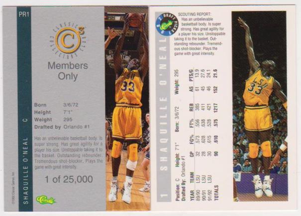 This is a pair of 1992 Shaquille O'Neal rookie cards.  You get one each of 1992 Classic 4-Sport C3 Collectors Club #PR1 Promo (1 of 25,000) card and 1992 Classic Draft Picks #1 card.  These C3 Promo is Near Mint and the Draft Picks #1 card is in approximately VG-EX condition.