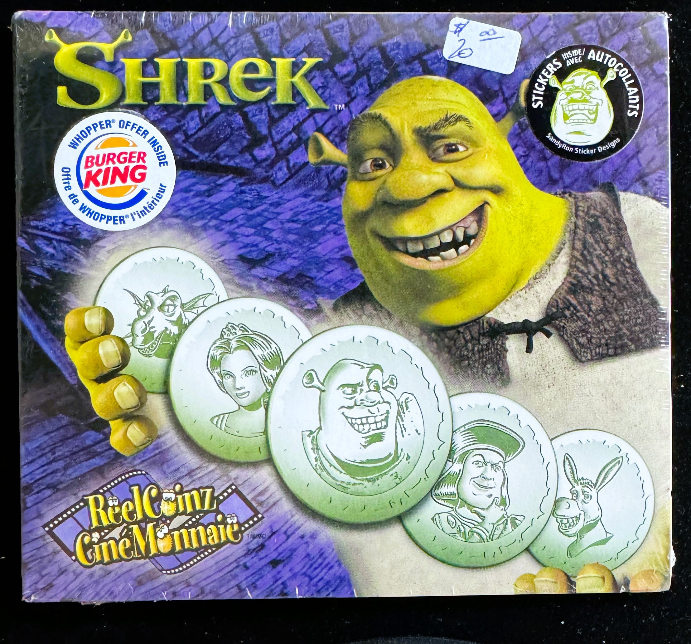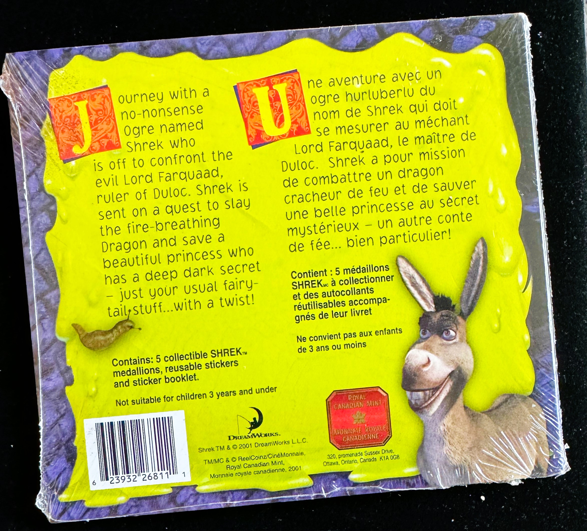 SHREK BURGER KING DREAMWORKS MEDALLION & STICKER SET, SEALED NEVER OPENED, LIKE NEW, COINS & CURRENCY