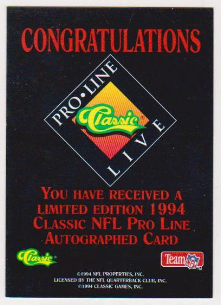 This is a 1994 Pro Line Live David Klingler certified autographed insert card.  Only 2140 of this card was produced and this one is #1298/2140.  This is a nice approximately Near Mint condition Klingler autograph that was a tough insert to pull from packs.