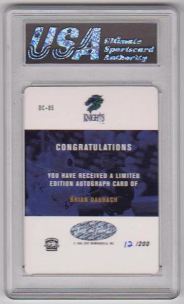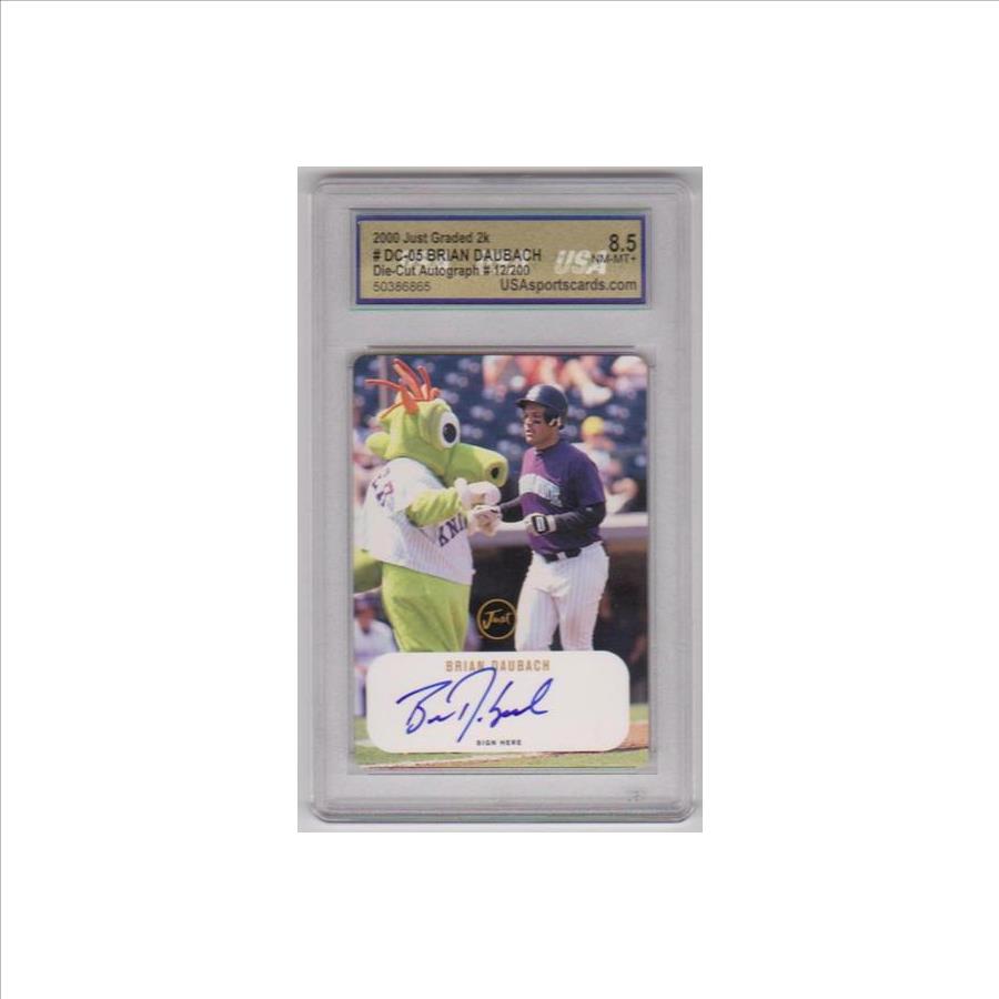 This is a 2000 Just Minors Graded 2K Die-Cut Version Brian Daubach #DC-05 certified autographed rookie insert card that has been graded a NM-MT+ 8.5 by USA Grading.  The holder has light surface wear, but the card inside is not affected at all.  Only 200 of this card was produced, and this one is #12/200.  This is a nice low production graded autographed Daubach minor league rookie card.