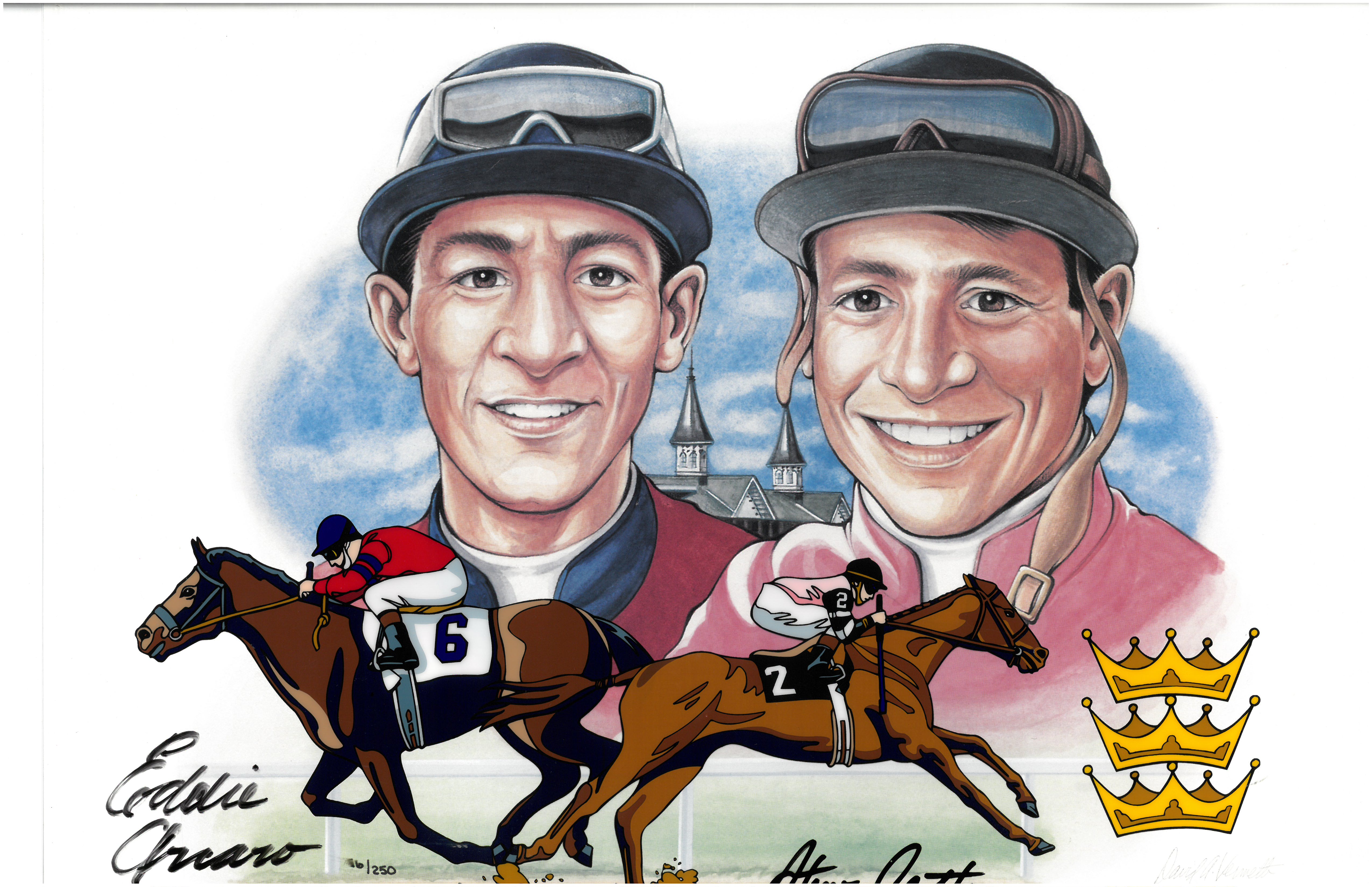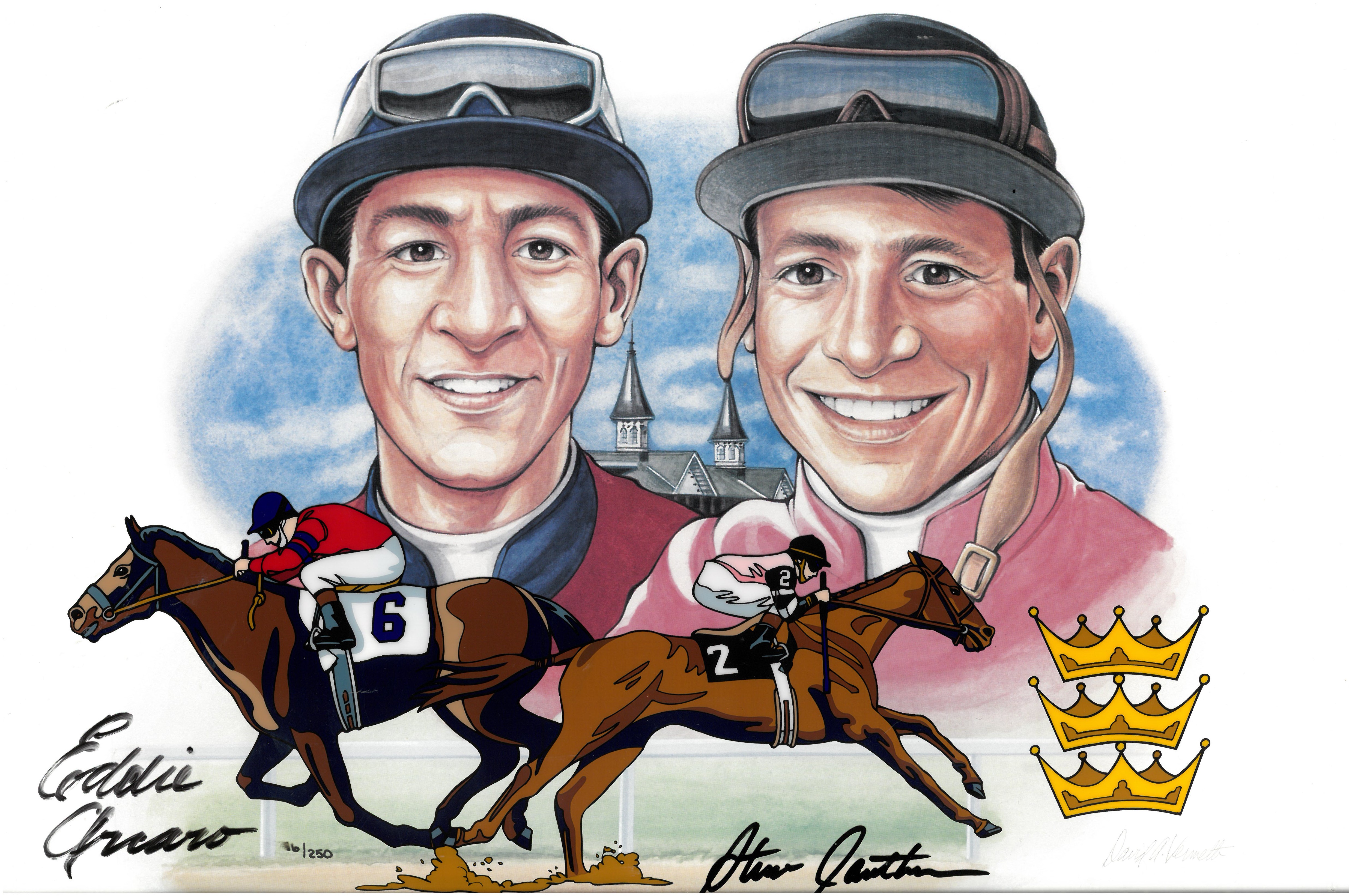 A limited edition Triple Crown-themed hand-painted cel and offset lithograph background after an piece by artist David Vermette, signed by jockeys Eddie Arcaro and Steve Cauthen. This print depicts a double-portrait of the pair with a rendering of both on horseback printed on acetate over top. This piece, signed in pencil by the artist and in marker by the subjects, is numbered /250 and is presented inside of protective plastic. Includes an 8x10 of Vermette and Cauthen signing the pieces and an 8x10 Certificate of Authenticity.
