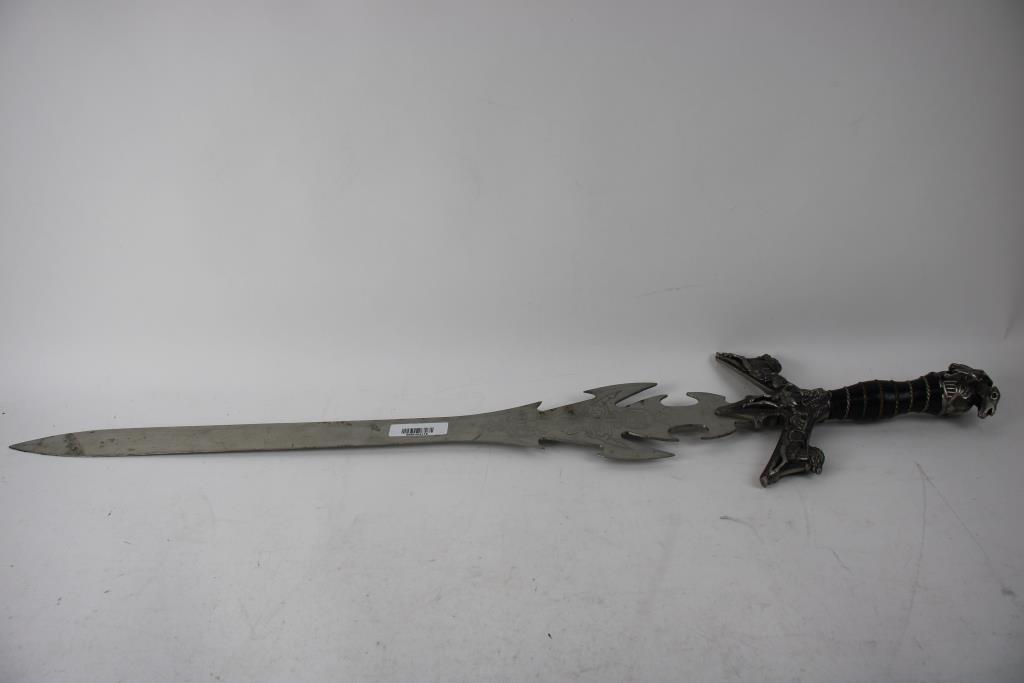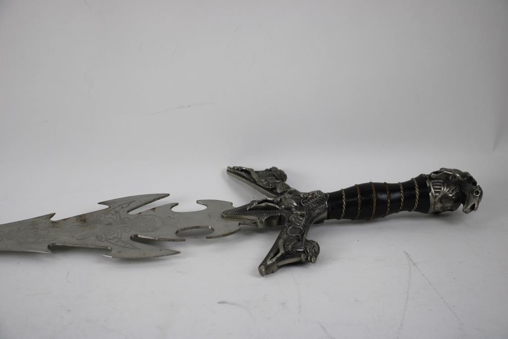 Silver Toned Sword With Designs On Blade And Mixed Material Handle