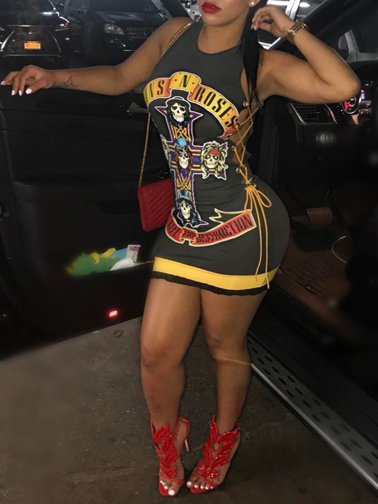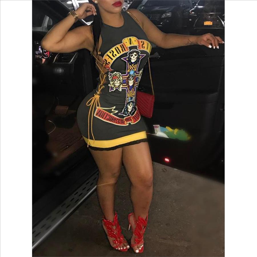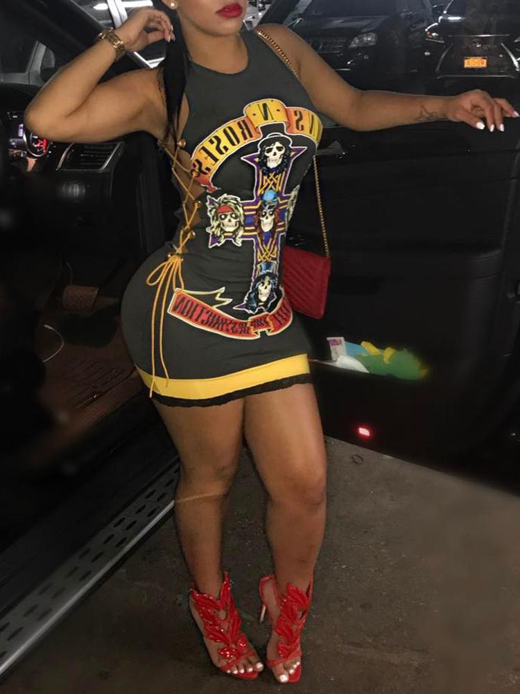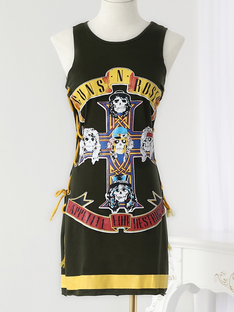 Skull Print Lace-Up Side Bodycon Mini Dress S