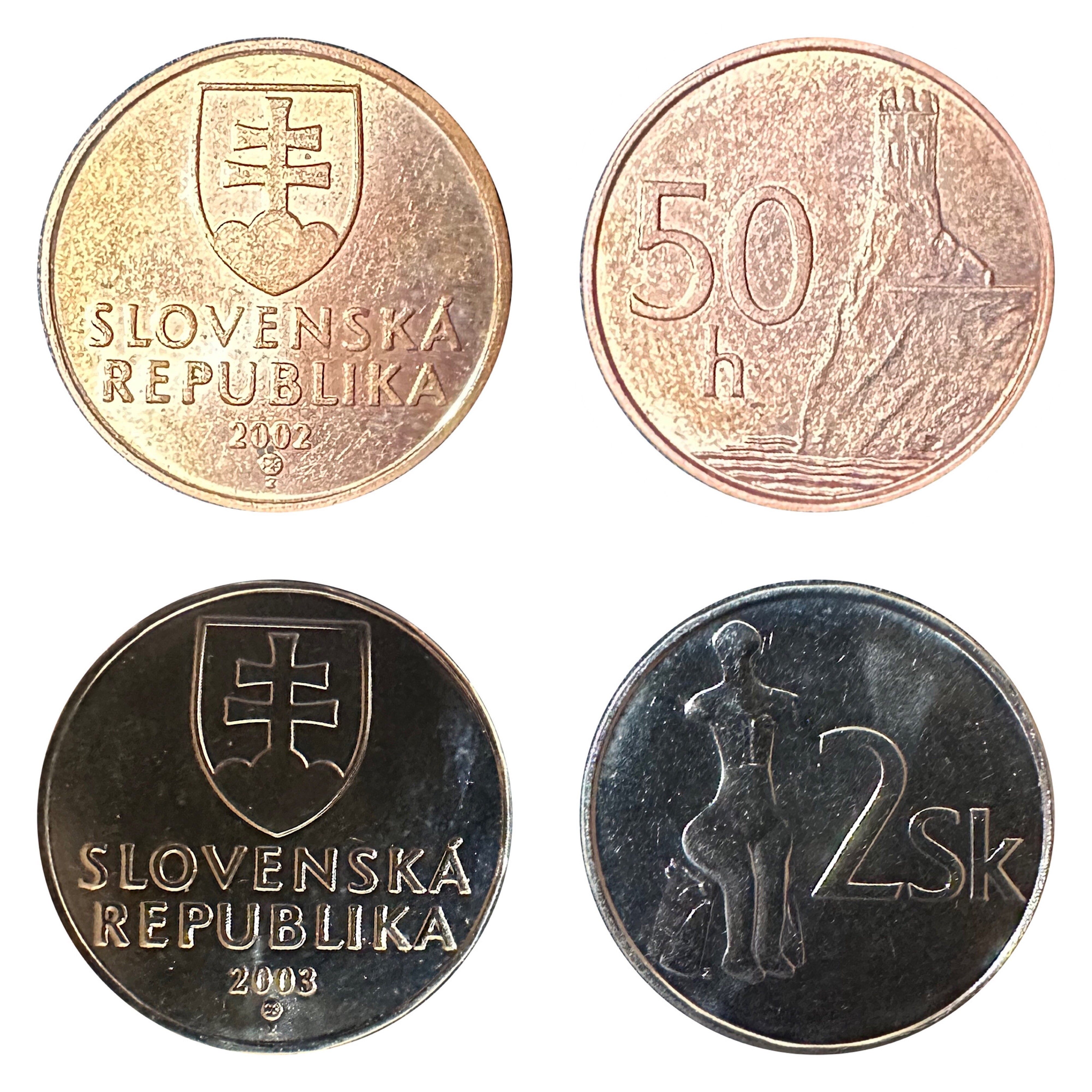 >Slovakia Coins - 2002 50 Halierov and 2003 2 Koruna with Double Cross and Venus Statue