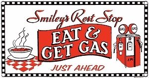 Smiley's Rest Stop Eat & Get Gas Tin Sign