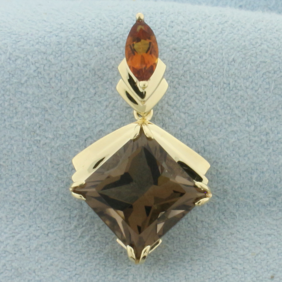 In 14k yellow gold. Contains one high quality natural 10mm princess cut smoky Topaz gemstone with warm color and excellent clarity. Also contains one high quality natural 7mm marquise cut spessartite garnet gemstone with vibrant color and excellent clarity. 1 1/8 inches long x 5/8 inches wide.2.9g.