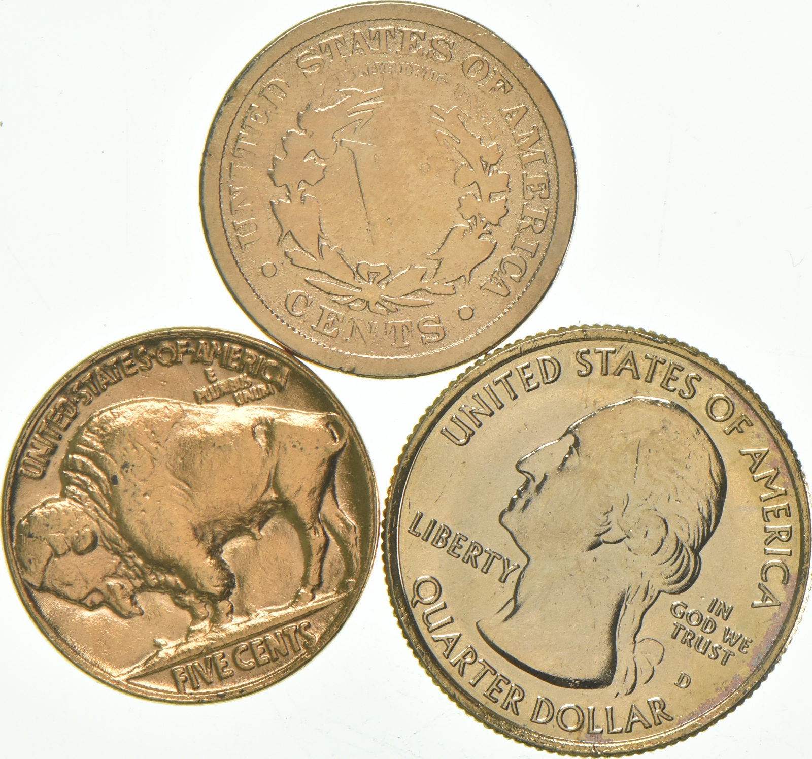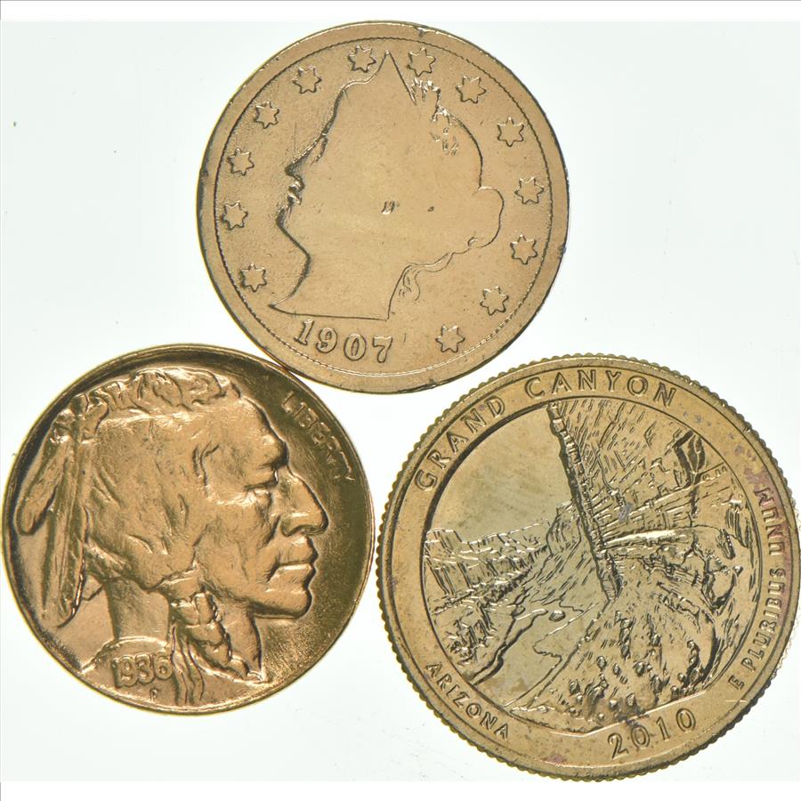 Solid 24K GOLD Plated Lot 1907 Liberty V Nickel 1936 Indian Head Buffalo Nickel 2010-D Grand Canyon ATB Quarter